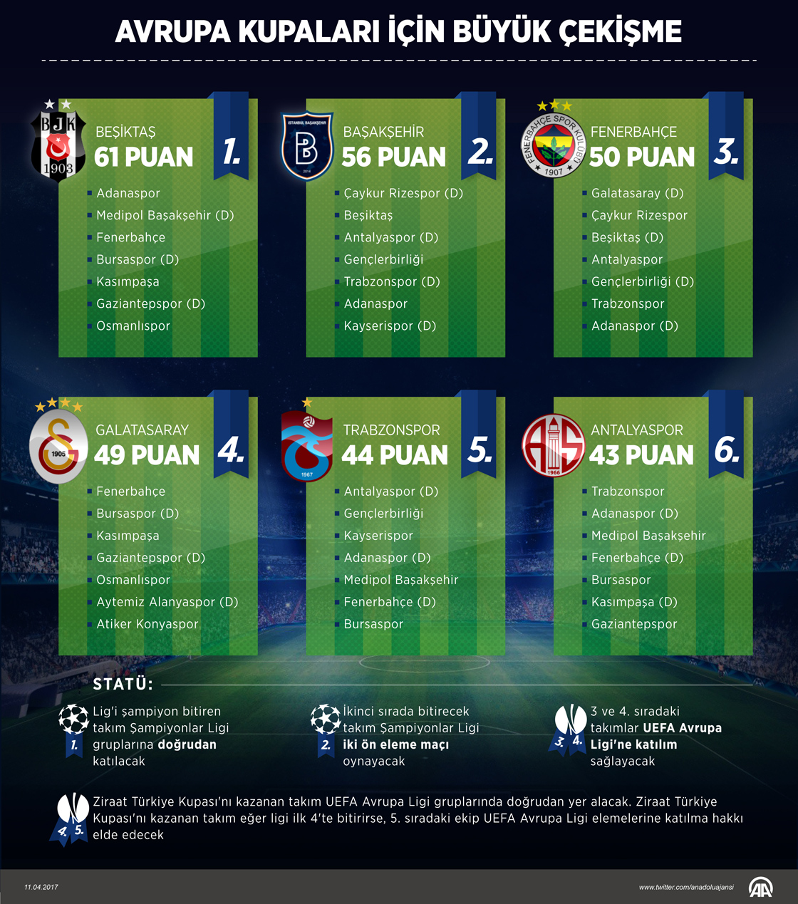 Süper Lig'de son 7 haftaya girilirken takımlar Avrupa kupalarına katılmak için mücadelelerini sürdürüyor.