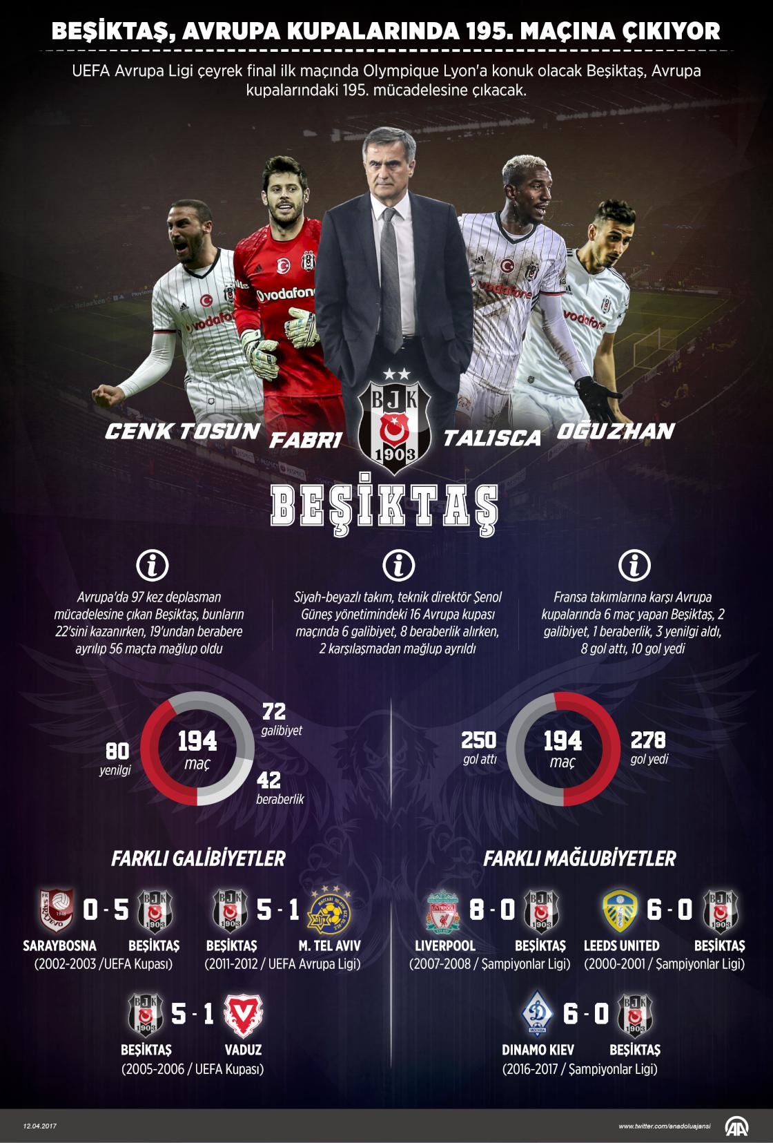 UEFA Avrupa Ligi çeyrek final ilk maçında yarın Fransa'nın Olympique Lyon takımına konuk olacak siyah-beyazlı ekip, Avrupa kupalarında yaptığı 194 müsabakada 72 galibiyet, 42 beraberlik ve 80 mağlubiyet aldı. Avrupa'da 97 kez deplasman mücadelesine çıkan Beşiktaş, bunların 22'sini kazanırken, 19'undan berabere ayrılıp 56 maçta mağlup oldu. Siyah-beyazlı takım, teknik direktör Güneş yönetimindeki 16 Avrupa kupası maçında 6 galibiyet, 8 beraberlik alırken, 2 karşılaşmadan mağlup ayrıldı.