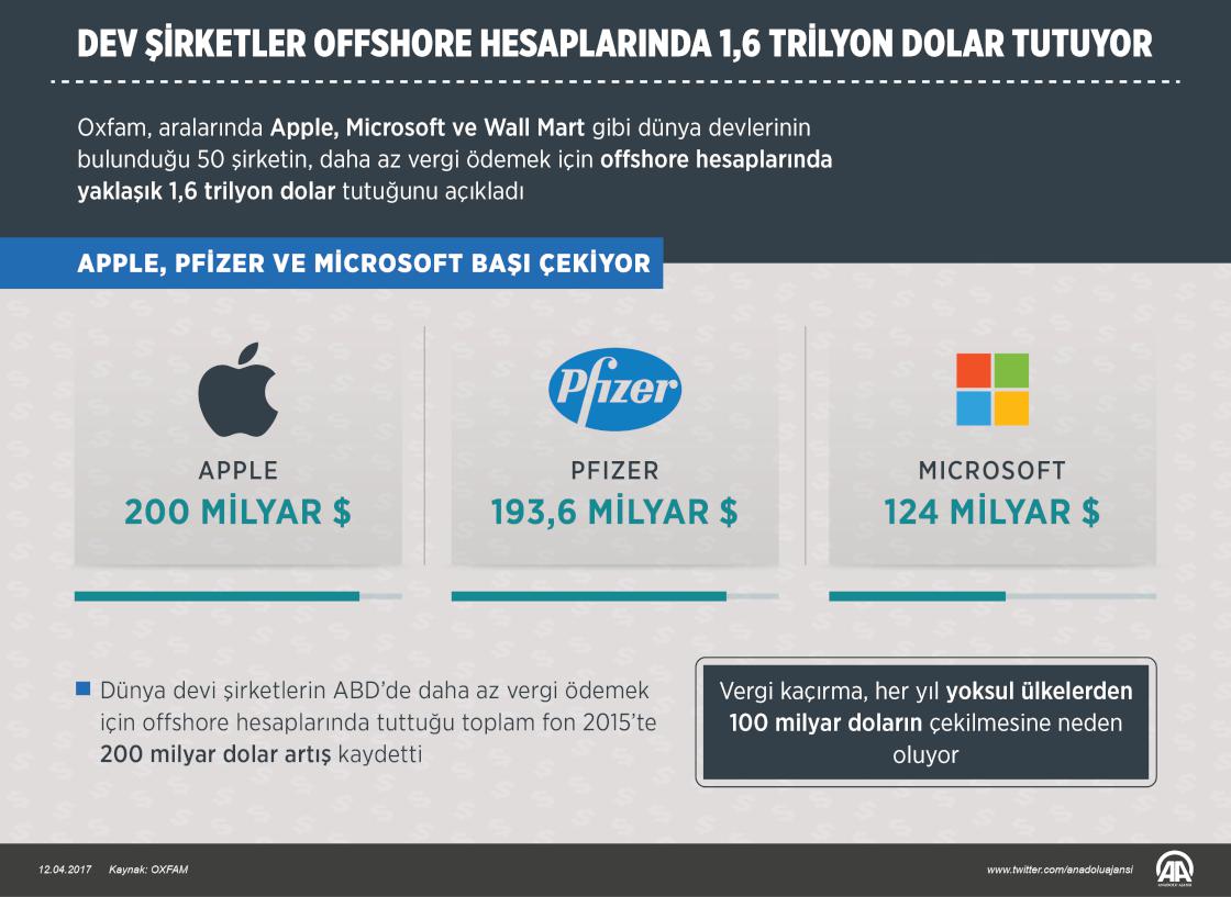 Oxfam, aralarında Apple, Microsoft ve Wall Mart gibi dünya devlerinin bulunduğu 50 şirketin, daha az vergi ödemek için offshore hesaplarında yaklaşık 1,6 trilyon dolar tutuğunu açıkladı. ( Yasin Demirci - Anadolu Ajansı )