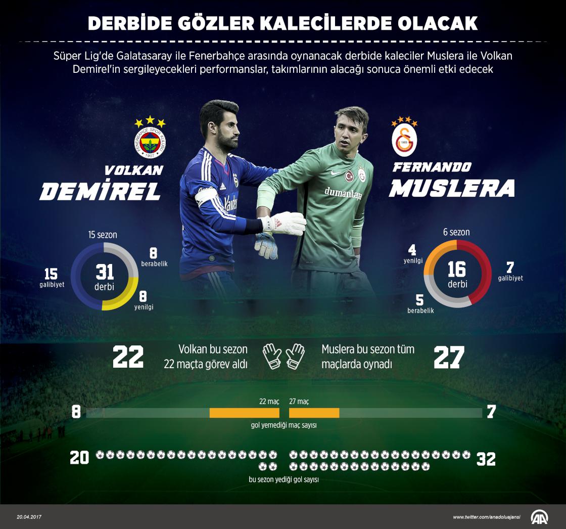 Spor Toto Süper Lig'de Galatasaray ile Fenerbahçe arasında 23 Nisan Pazar günü oynanacak derbide gözler iki takımın kalecilerinde olacak. Türk Telekom Arena'da yapılacak karşılaşmada kaleyi korumaları beklenen Galatasaray'ın 30 yaşındaki Uruguaylı kalecisi Fernando Muslera ile Fenerbahçe'nin 35 yaşındaki file bekçisi Volkan Demirel'in sergileyeceği performans, derbinin sonucuna doğrudan etki edecek. Galatasaray'da 6 sezondur forma giyen Muslera ile Fenerbahçe'de 15. sezonunu geçiren Volkan Demirel'in derbide ortaya koyacağı mücadele, takımları adına büyük önem taşıyacak. ( Muhammed Ali Yiğit - Anadolu Ajansı )20 Nisan 2017•Güncelleme: 20 Nisan 2017