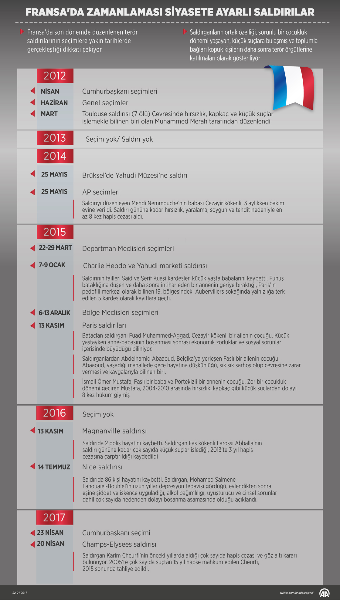 Fransa'da son dönemde düzenlenen terör saldırılarının seçimlere yakın tarihlerde gerçekleşmesi dikkati çekiyor.