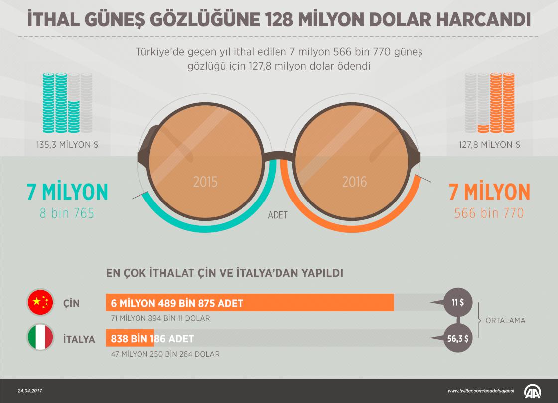 Türkiye'de geçen yıl ithal edilen 7 milyon 566 bin 770 güneş gözlüğü için 127,8 milyon dolar ödendi. Güneş gözlükleri Çin'den ortalama 11 dolar, İtalya'dan 56,3 dolara ithal edildi. ( Yasin Demirci - Anadolu Ajansı )