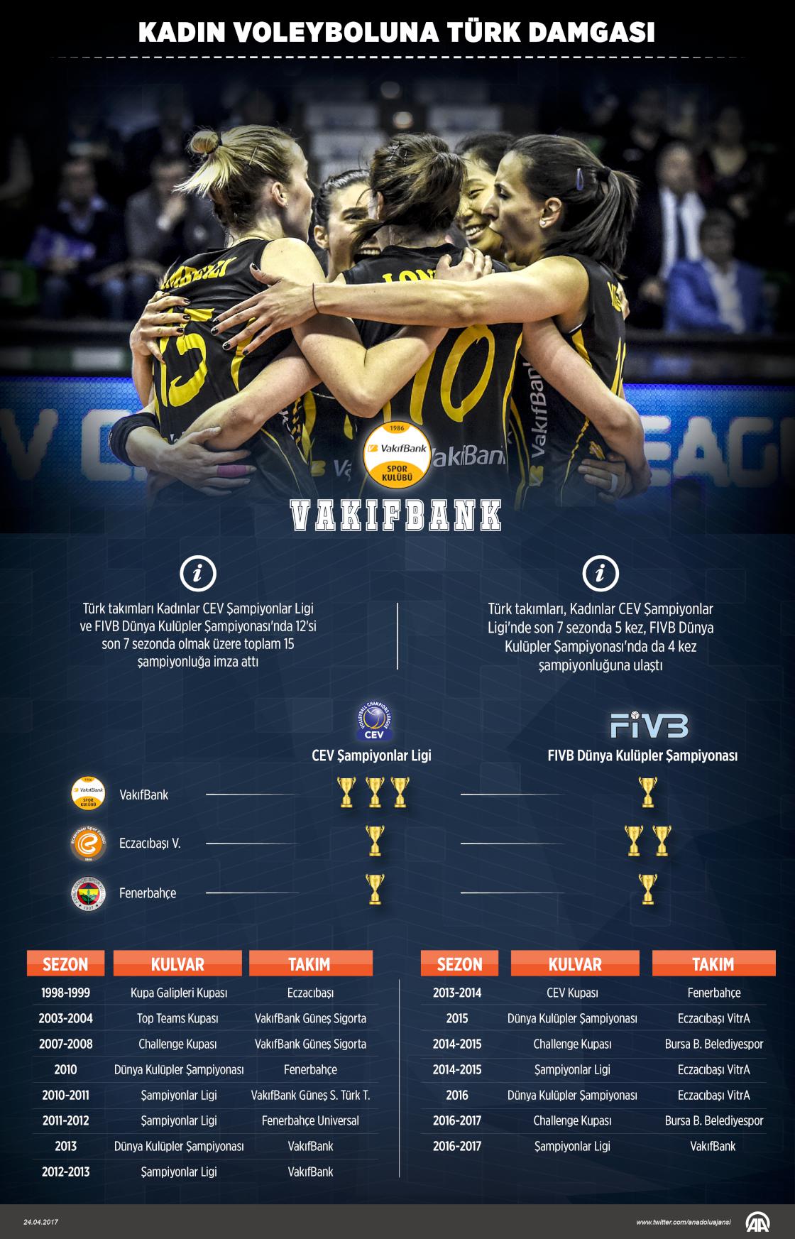 Türk takımları, Kadınlar CEV Şampiyonlar Ligi'nde son 7 sezonda 5 kez Avrupa şampiyonluğuna ulaşırken, FIVB Dünya Kulüpler Şampiyonası'nda son 7 kupanın 4'ünü kazandı. CEV Şampiyonlar Ligi'nde bu sezonu zirvede tamamlayan VakıfBank, 3 kez Avrupa'nın en büyüğü olurken, Eczacıbaşı VitrA ve Fenerbahçe birer kez kupaya uzandı. FIVB Dünya Kulüpler Şampiyonası'nda 2010'dan bu yana düzenlenen 7 organizasyonda Eczacıbaşı VitrA iki, VakıfBank ve Fenerbahçe ise birer kez dünya şampiyonu oldu. Türk takımları CEV ve FIVB'ın organizasyonlarında 12'si son 7 sezonda olmak üzere toplam 15 şampiyonluğa imza attı. ( Muhammed Ali Yiğit - Anadolu Ajansı )24 Nisan 2017•Güncelleme: 24 Nisan 2017