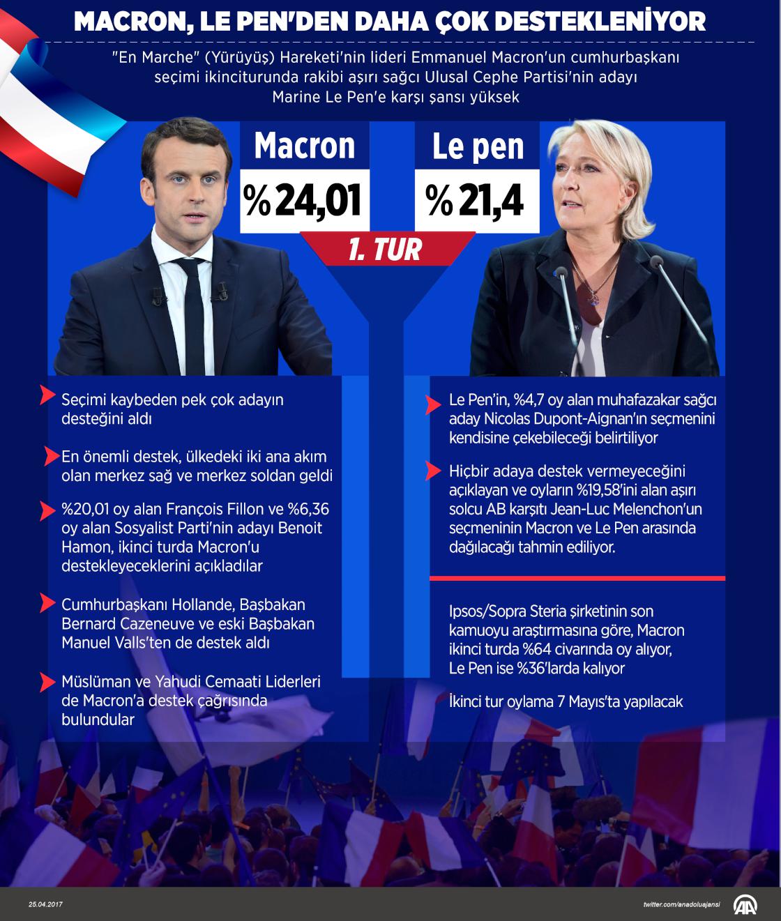 "En Marche (Yürüyüş)" Hareketi'nin lideri Emmanuel Macron'un cumhurbaşkanı seçimi ikinci turunda rakibi aşırı sağcı Ulusal Cephe Partisi'nin adayı Marine Le Pen'e karşı şansı daha yüksek görünüyor.