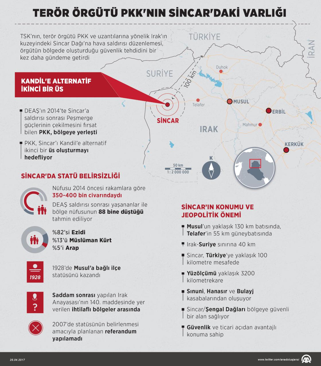 TSK'nın terör örgütü PKK ve uzantılarına yönelik Irak'ın kuzeyindeki Sincar Dağı'na hava saldırısı düzenlemesi, örgütün bölgede oluşturduğu güvenlik tehdidini yeniden gündeme taşıdı. DEAŞ'ın 3 Ağustos 2014'te Ezidilerin çoğunlukta yaşadığı Musul'un Sincar ilçesini ele geçirmesini bahane ederek Kandil ve Suriye'den gönderdiği militanlar vasıtasıyla bölgeye yerleşen PKK, ilçenin jeostratejik avantajından da yararlanarak, Kandil'e alternatif ikinci bir üs oluşturmayı hedefledi. Terör örgütü DEAŞ'ın 2014'teki saldırısının ardından bölge nüfusunun 88 bine düştüğü tahmin ediliyor. Sincar nüfusunun yüzde 82'si Ezidi, yüzde 13'ü Müslüman-Kürt, yüzde 5'i ise Araplardan oluşuyor. ( Murat Usubaliev - Anadolu Ajansı )25 Nisan 2017•Güncelleme: 25 Nisan 2017