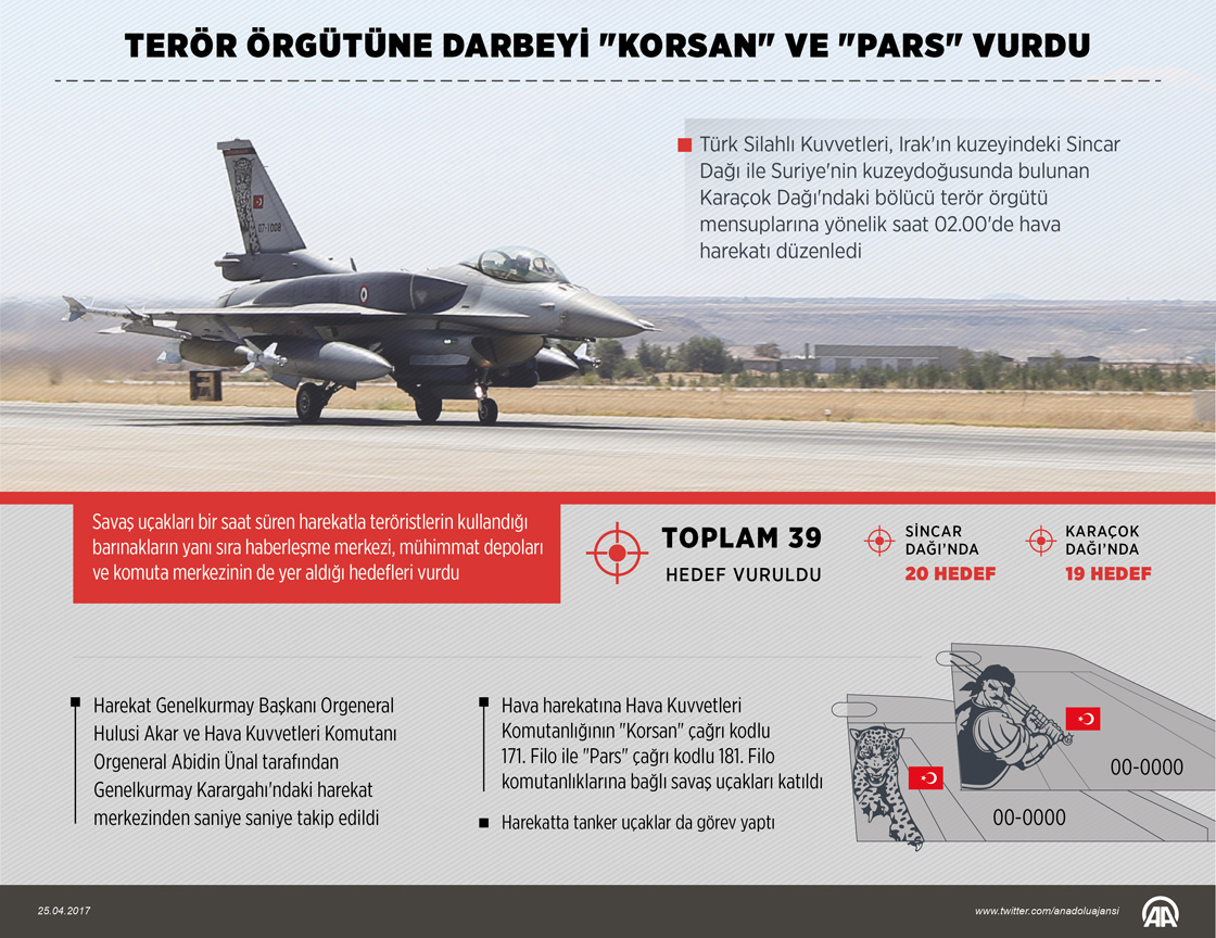 Türk Silahlı Kuvvetleri, Irak'ın kuzeyindeki Sincar Dağı ile Suriye'nin kuzeydoğusunda bulunan Karaçok Dağı'ndaki bölücü terör örgütü mensuplarına yönelik saat 02.00'de hava harekatı düzenledi. Savaş uçakları bir saat süren harekatla teröristlerin kullandığı barınakların yanı sıra haberleşme merkezi, mühimmat depoları ve komuta merkezinin de yer aldığı Sincar Dağı'ndaki 20, Karaçok Dağı'ndaki 19 hedef vurdu. Hava harekatına Hava Kuvvetleri Komutanlığının "Korsan" çağrı kodlu 171. Filo ile "Pars" çağrı kodlu 181. Filo komutanlıklarına bağlı savaş uçakları katıldı. ( Ahmet Burak Özkan - Anadolu Ajansı )25 Nisan 2017•Güncelleme: 25 Nisan 2017