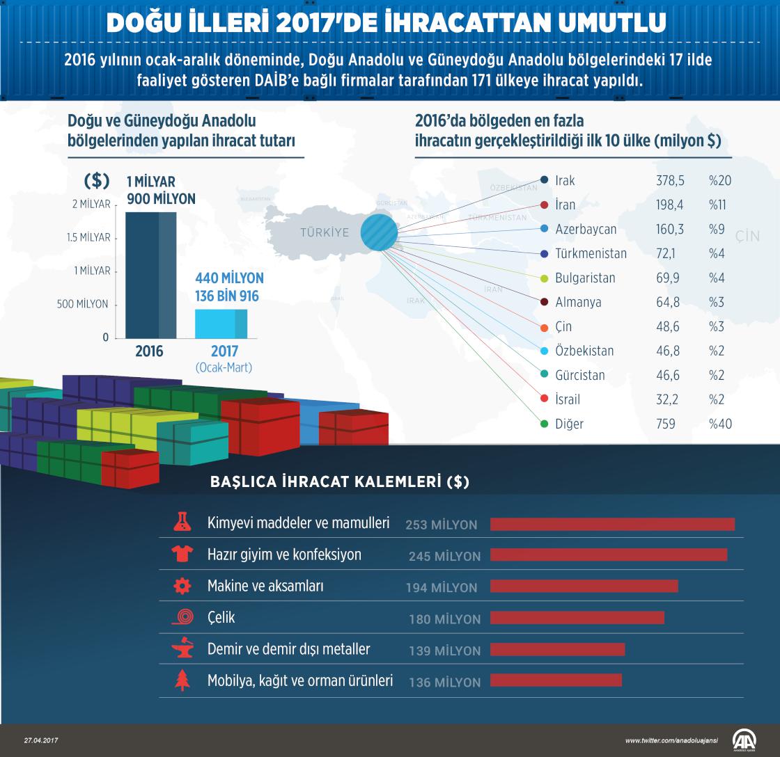 Geçen yıl 17 ilden 1 milyar 900 milyon dolarlık, bu yılın ilk çeyreğinde ise 440 milyon 136 bin 916 dolarlık ihracatın yapıldığı Doğu ve Güneydoğu Anadolu bölgelerinde, bu yıl ihracatın artırılması hedefleniyor. ( Gözde Gültekinler - Anadolu Ajansı )