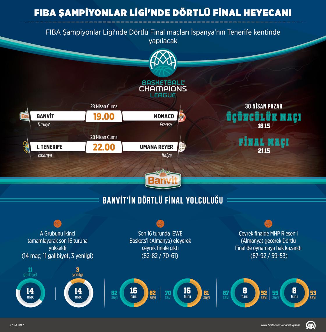 Bu yıl ilk kez organize edilen FIBA Şampiyonlar Ligi'nde Dörtlü Final, yarın İspanya'nın Tenerife kentinde başlayacak. Dörtlü Final'de Türkiye'yi temsil edecek Banvit Basketbol Takımı'nın yanı sıra İspanya'dan Iberostar Tenerife, İtalya'dan Umana Reyer ve Fransa'dan Monaco takımları, şampiyonluk mücadelesi verecek. ( Muhammed Ali Yiğit - Anadolu Ajansı )27 Nisan 2017•Güncelleme: 27 Nisan 2017