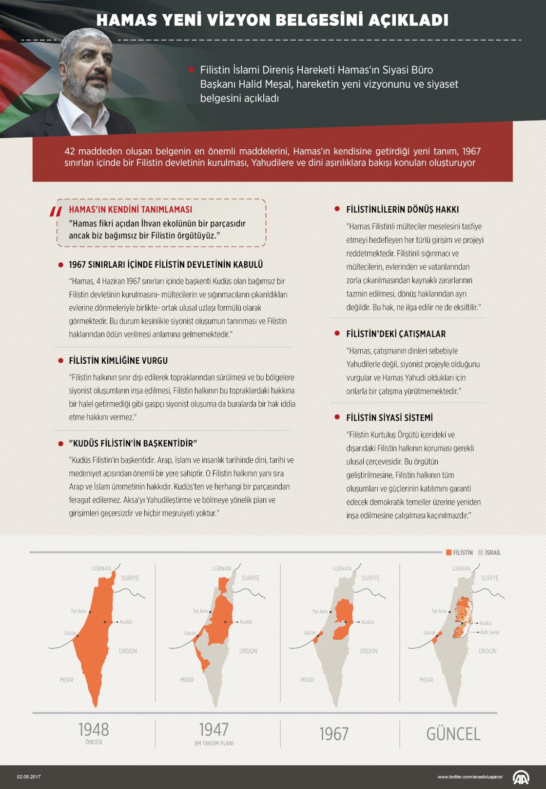 Filistin İslami Direniş Hareketi Hamas'ın Siyasi Büro Başkanı Halid Meşal, hareketin yeni vizyonunu ve siyaset belgesini açıkladı. 42 maddeden oluşan belgenin dayandığı temel düşünceye açıklık getiren Meşal, bu belgenin Hamas hareketinin yeniliklere açık olduğunun kanıtı olduğunu aktardı. ( Ahmet Burak Özkan - Anadolu Ajansı )02 Mayıs 2017•Güncelleme: 02 Mayıs 2017