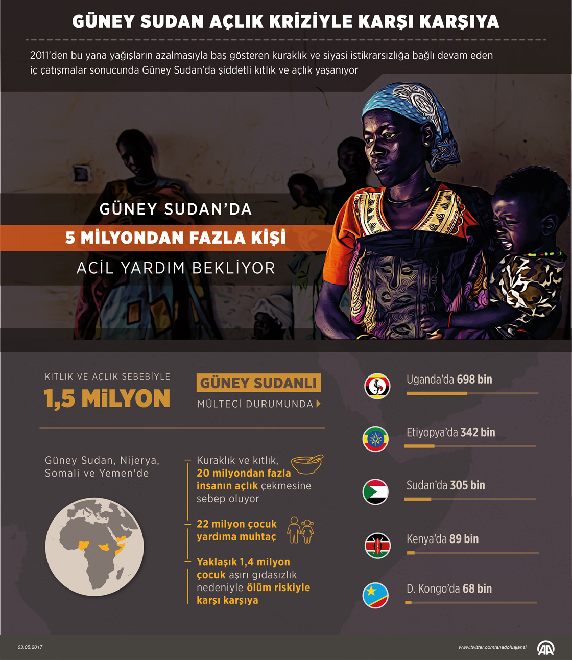 Güney Sudan, 2011'den bu yana yağışların azalmasıyla baş gösteren kuraklık ve siyasi istikrarsızlığın beraberinde getirdiği iç çatışmalar nedeniyle şiddetli kıtlık ve açlıkla boğuşuyor.