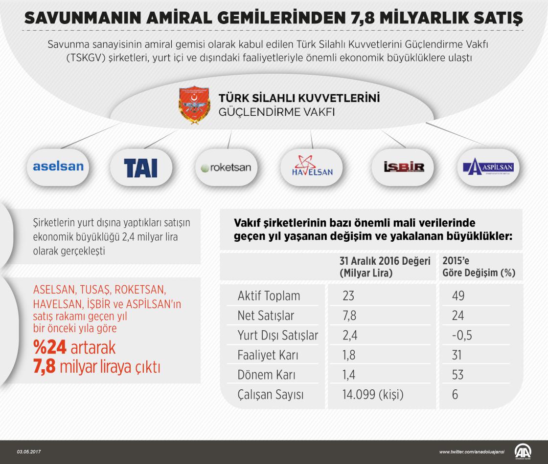 ASELSAN, TUSAŞ, ROKETSAN, HAVELSAN, İŞBİR ve ASPİLSAN'ın satış rakamı geçen yıl bir önceki yıla göre yüzde 24 artarak 7,8 milyar liraya çıktı. Şirketlerin yurt dışına yaptıkların satışın ekonomik büyüklüğü ise 2,4 milyar lira olarak gerçekleşti. ( Gözde Gültekinler - Anadolu Ajansı )03 Mayıs 2017•Güncelleme: 03 Mayıs 2017