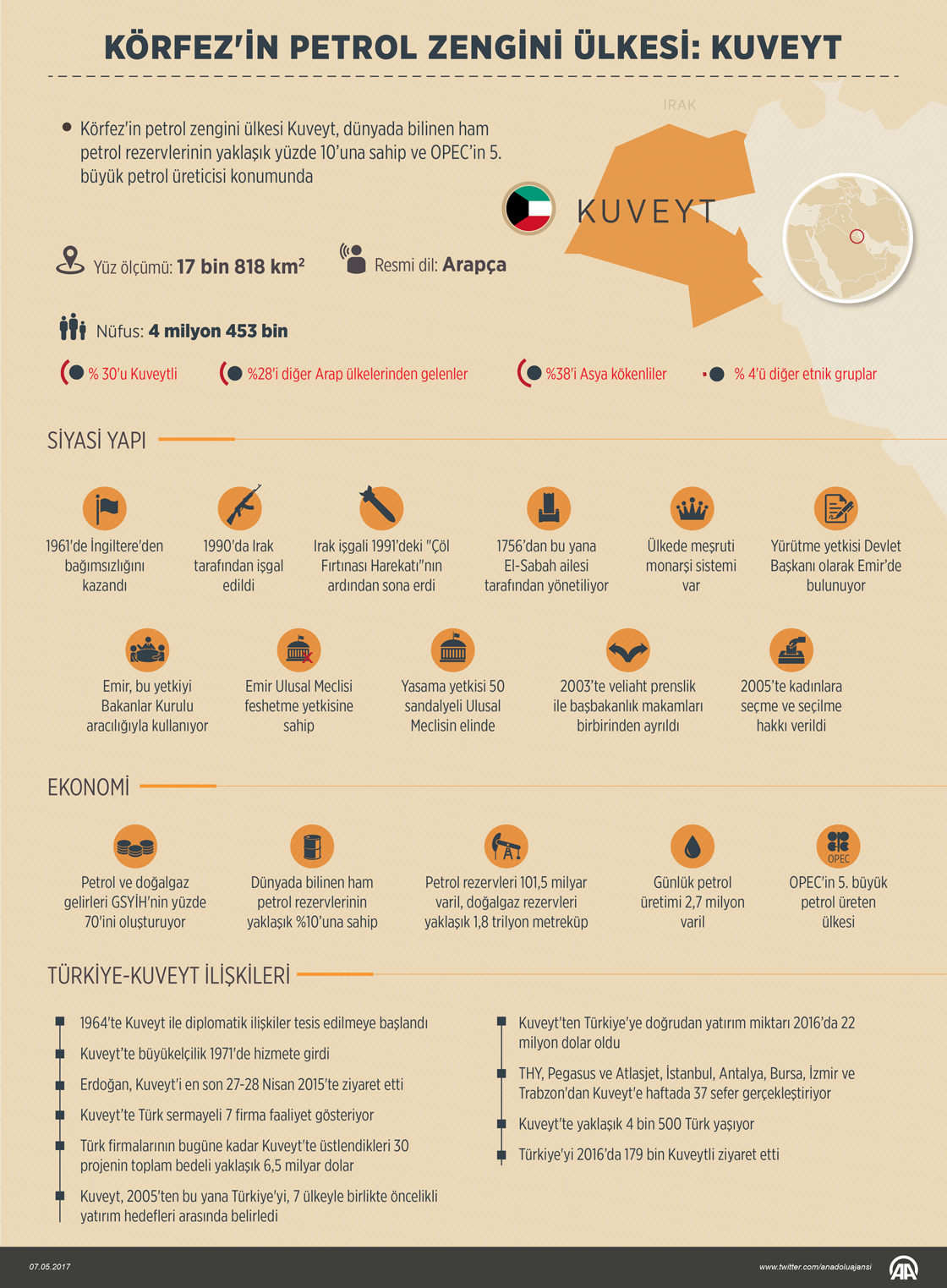 Körfez'in petrol zengini ülkesi Kuveyt, dünyada bilinen ham petrol rezervlerinin yaklaşık yüzde 10’una sahip ve Petrol İhraç Eden Ülkeler Birliğinin (OPEC) 5. büyük petrol üreticisi konumunda. Cumhurbaşkanı Recep Tayyip Erdoğan'ın, son olarak iki yıl önce gittiği Kuveyt'i 8-9 Mayıs tarihlerinde tekrar ziyaret edecek olması kamuoyunun dikkatini bu ülkeye çevirmesine yol açtı. Grafik: AA/Yasin Demirci07 Mayıs 2017•Güncelleme: 07 Mayıs 2017