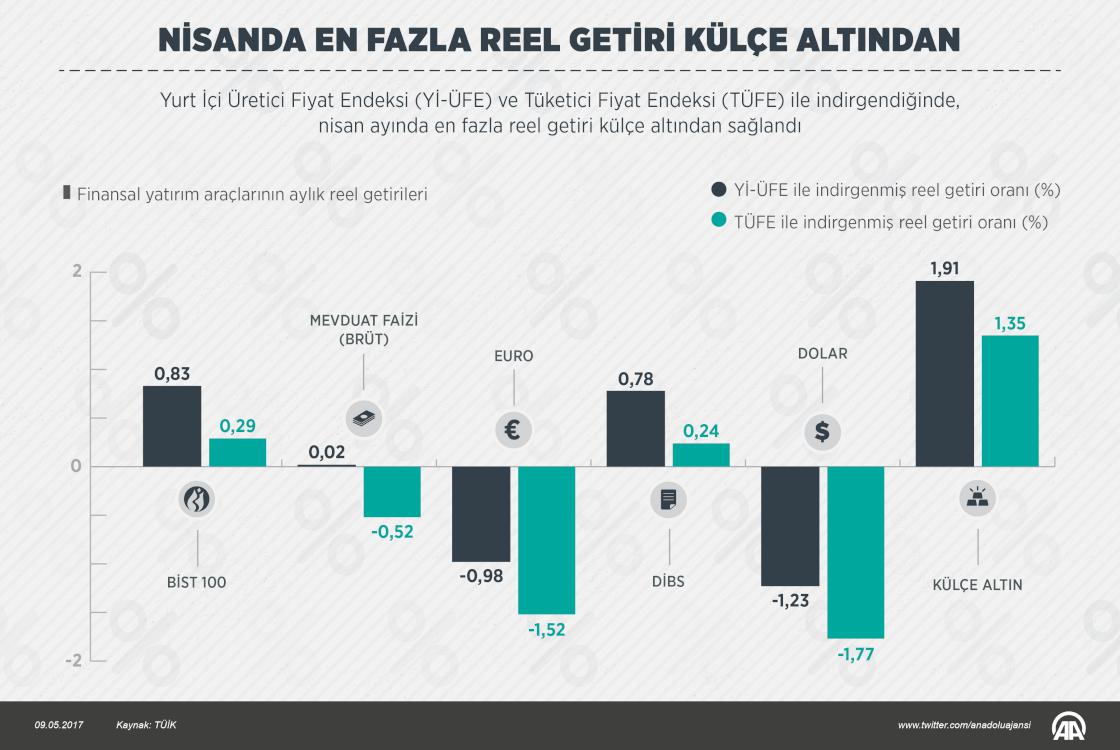 Yurt İçi Üretici Fiyat Endeksi (Yİ-ÜFE) ve Tüketici Fiyat Endeksi (TÜFE) ile indirgendiğinde, nisan ayında en fazla reel getiri külçe altından sağlandı. ( Muhammed Ali Yiğit - Anadolu Ajansı )