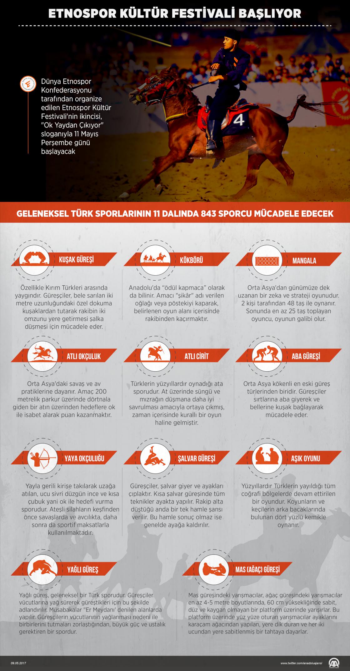 Dünya Etnospor Konfederasyonu tarafından organize edilen ve Anadolu Ajansının (AA) global iletişim ortağı olduğu Etnospor Kültür Festivali'nin ikincisi, "Ok Yaydan Çıkıyor" sloganıyla 11 Mayıs Perşembe günü İstanbul'da başlayacak. ( Muhammed Ali Yiğit - Anadolu Ajansı )09 Mayıs 2017•Güncelleme: 09 Mayıs 2017