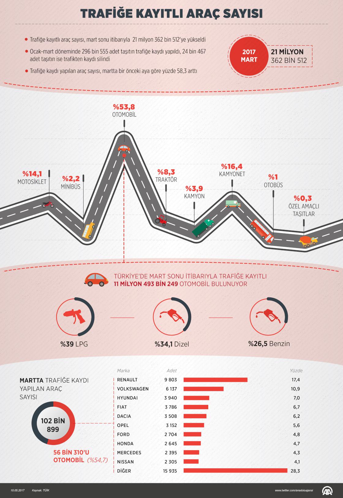Bu yılın ocak-mart döneminde 296 bin 555 taşıtın trafiğe kaydı yapıldı, 24 bin 467 taşıtın ise trafikten kaydı silindi. Böylece trafikteki toplam taşıt sayısı 272 bin 88 arttı.