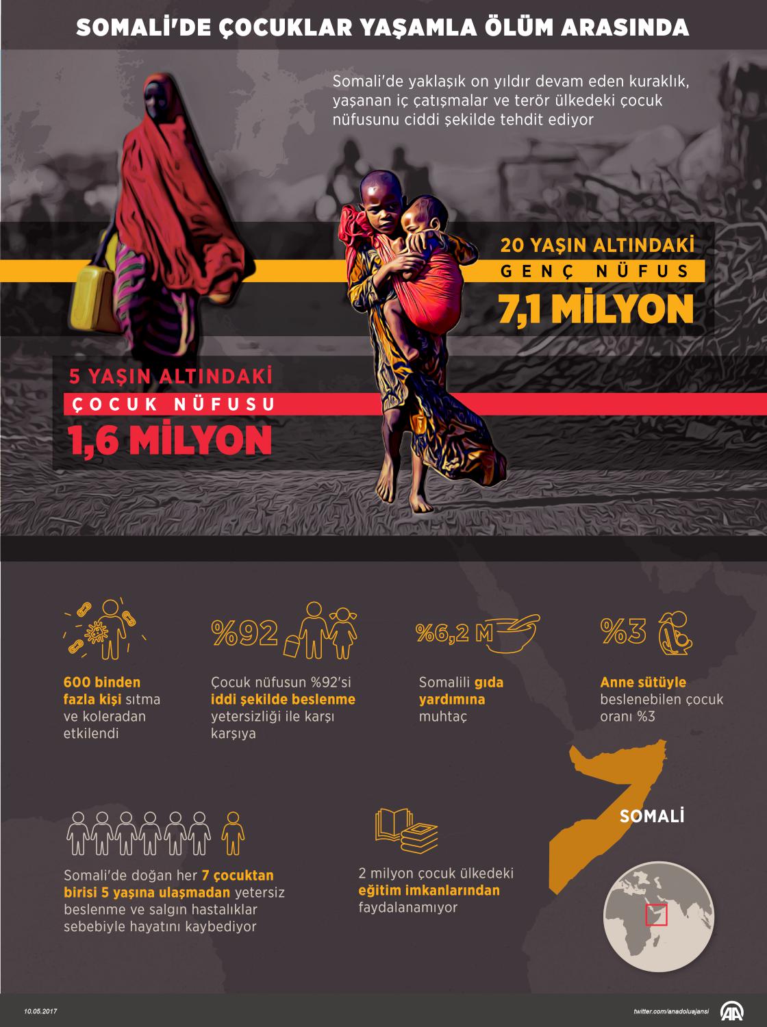 Somali'de yaklaşık 10 yıldır devam eden kuraklık, iç çatışmalar ve terör, ülkedeki çocuk nüfusunu ciddi şekilde tehdit ediyor. Dünyanın en yoksul 10 ülkesinden 12 milyon nüfuslu Somali'de 2011'den bu yana süren kuraklığa bağlı kıtlık sebebiyle 6,2 milyon kişi gıda yardımına, 2,9 milyon kişi acil yardıma ihtiyaç duyuyor. Ülkedeki çocuk nüfusu da yetersiz beslenme ve salgın hastalıklar gibi ciddi tehditlerle karşı karşıya. Birleşmiş Milletler Çocuklara Yardım Fonunun (UNICEF) 2014 verilerine göre, ülkede 20 yaşının altındaki genç nüfus 7,1 milyona, 5 yaşının altındaki nüfus 1,6 milyon civarında. Ülkedeki çocuk nüfusunun yüzde 92'si ciddi şekilde beslenme yetersizliğine maruz kalmış durumda. ( Murat Usubaliev - Anadolu Ajansı )10 Mayıs 2017•Güncelleme: 10 Mayıs 2017