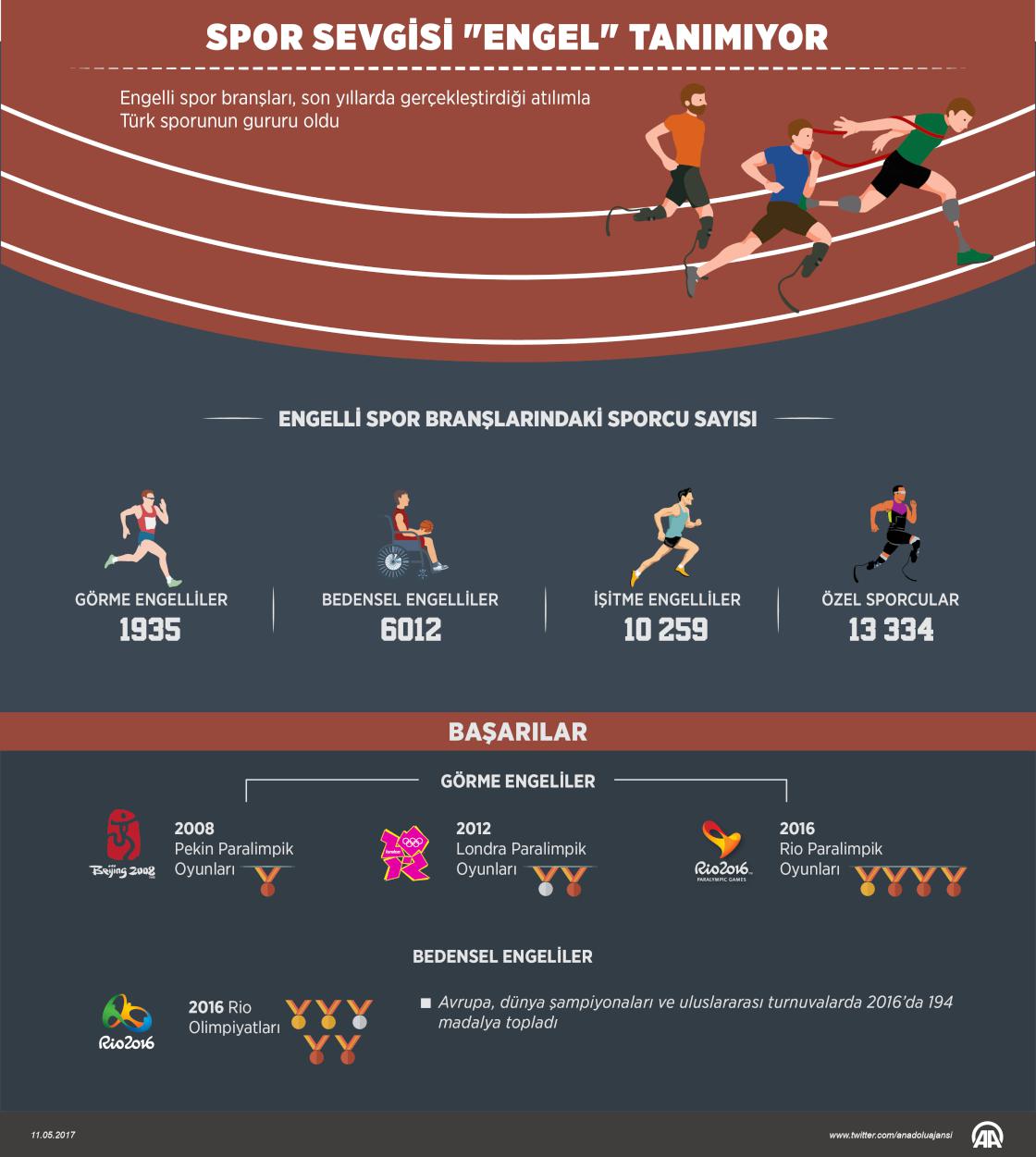 Engelli spor branşları, son yıllarda gerçekleştirdiği atılımla Türk sporunun gururu oldu. Gençlik ve Spor Bakanlığı tarafından yapılan yatırımlar sonuç verirken, sporcu sayısı ve madalyalardaki artış, katlanarak devam etti. ( Muhammed Ali Yiğit - Anadolu Ajansı )11 Mayıs 2017•Güncelleme: 11 Mayıs 2017