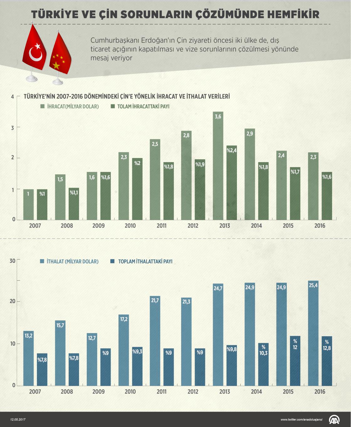 Cumhurbaşkanı Recep Tayyip Erdoğan'ın Çin'deki temasları öncesinde iki ülke de dış ticaret açığının kapatılması ve vize sorunlarının çözülmesi yönünde ortak mesaj veriyor. Cumhurbaşkanı Erdoğan'ın, Çin Devlet Başkanı Şi Cinping'in davetiyle "Kuşak ve Yol Zirvesi"ne katılmak üzere, bugün başlayan seyahatinde, iki ülke dış ticaretinde yaşanan sorunlara çözüm bulunması ve ihracatın artırılmasına yönelik adımların atılması öngörülüyor. ( Muhammed Ali Yiğit - Anadolu Ajansı )12 Mayıs 2017•Güncelleme: 12 Mayıs 2017