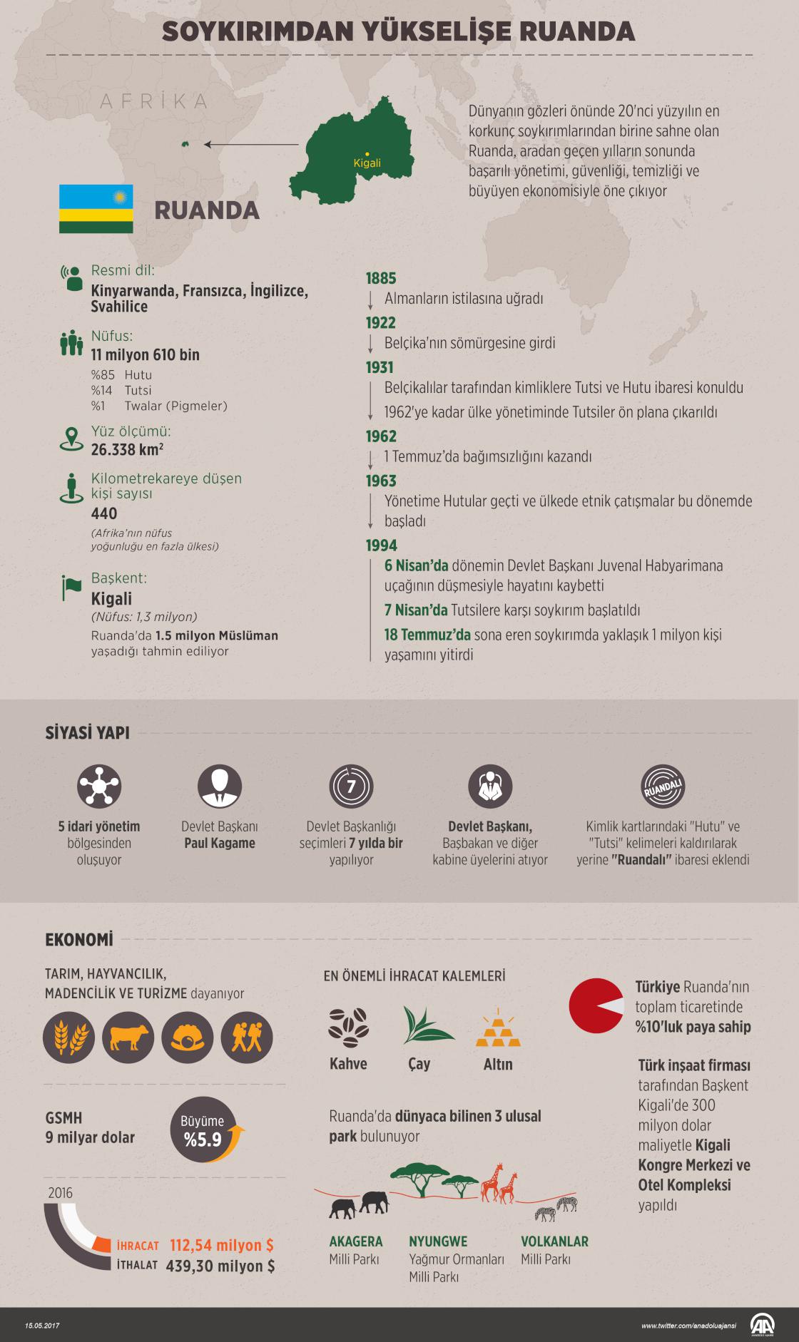 Dünyanın gözleri önünde 20'nci yüzyılın en korkunç soykırımlarından birine sahne olan Ruanda, aradan geçen yılların sonunda başarılı yönetimi, güvenliği, temizliği ve büyüyen ekonomisiyle öne çıkıyor. ( Murat Usubaliev - Anadolu Ajansı )