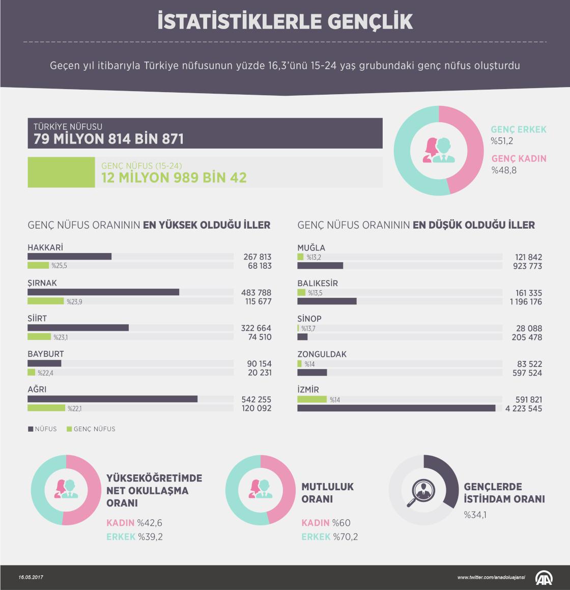 Türkiye'de geçen yıl itibarıyla 12 milyon 989 bin 42 genç bulunuyor. Nüfusun yüzde 16,3'ünü gençler oluşturuyor. Genç nüfus oranının en yüksek olduğu il yüzde 25,5 ile Hakkari oldu. ( Yasin Demirci - Anadolu Ajansı )