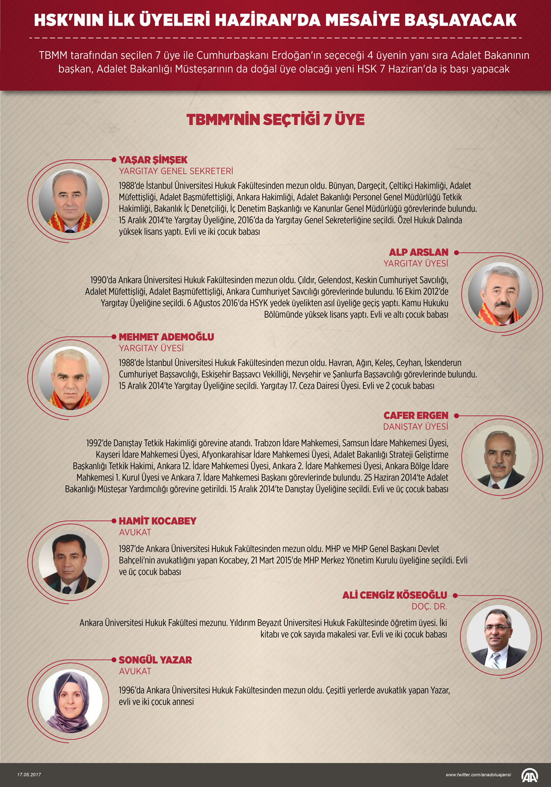 TBMM tarafından seçilen 7 üye ile Cumhurbaşkanı Recep Tayyip Erdoğan'ın seçeceği 4 üyenin yanı sıra Adalet Bakanının başkan, Adalet Bakanlığı Müsteşarının da doğal üye olacağı yeni Hakimler ve Savcılar Kurulu (HSK) haziranda mesaiye başlayacak.17 Mayıs 2017•Güncelleme: 17 Mayıs 2017