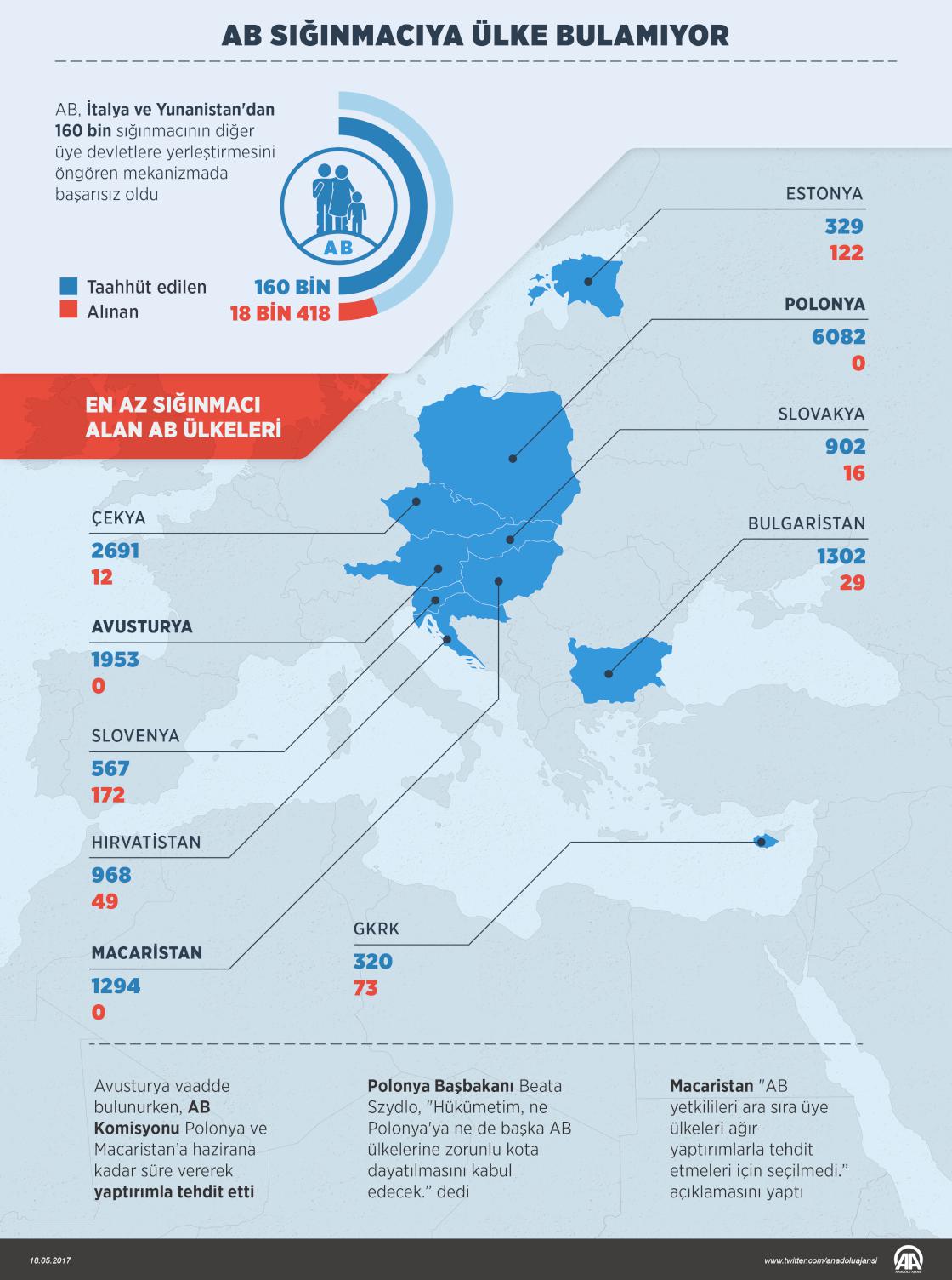 İtalya ve Yunanistan'dan 160 bin sığınmacının diğer üye devletlere yerleştirmesini öngören mekanizma kapsamında tek bir sığınmacı dahi almayan Macaristan ve Polonya'ya hazirana kadar süre vererek yaptırım tehdidinde bulundu. Bu ülkelerin yetkilileri ise açıklamarıyla Brüksel'e karşı direneceklerini gösterdi. ( Murat Usubaliev - Anadolu Ajansı )18 Mayıs 2017•Güncelleme: 18 Mayıs 2017