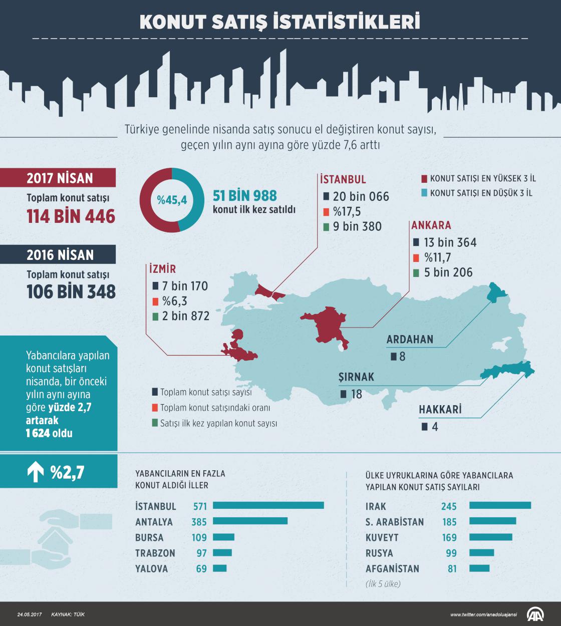 Türkiye İstatistik Kurumu (TÜİK), nisan ayına ilişkin konut satış istatistiklerini açıkladı. Türkiye genelinde nisanda 114 bin 446 konut satıldı. Geçen ay satılan konut sayısı, bir önceki aya göre yüzde 11,2 azalırken, geçen yılın aynı ayına göre ise yüzde 7,6 artış kaydetti. İstanbul 20 bin 66 konut satışıyla en yüksek paya (yüzde 17,5) sahip oldu. Satış sayılarına göre İstanbul'u, 13 bin 364 konut satışıyla (yüzde 11,7) Ankara, 7 bin 170 konut satışıyla (yüzde 6,3) İzmir izledi. Konut satış sayısının düşük olduğu iller ise 4 konutla Hakkari, 8 konutla Ardahan ve 18 konutla Şırnak olarak kayıtlara geçti. Türkiye genelinde ilk defa satılan konut sayısı, nisanda geçen yılın aynı ayına göre yüzde 10,8 artarak 51 bin 988 oldu. Yabancılara yapılan konut satışları nisanda geçen yılın aynı ayına göre yüzde 2,7 artarak bin 624 oldu. ( Ahmet Burak Özkan - Anadolu Ajansı )24 Mayıs 2017•Güncelleme: 24 Mayıs 2017