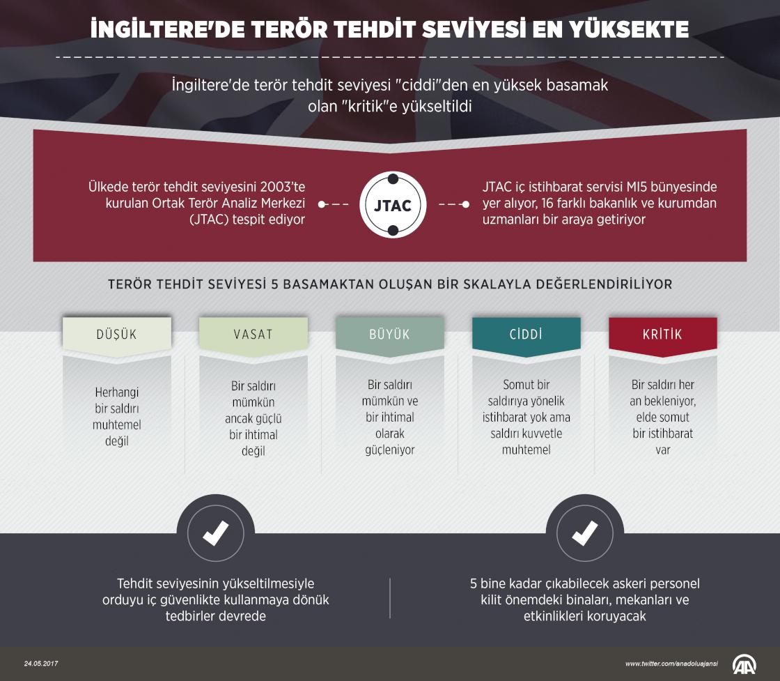 İngiltere, son 11 yılda terör tehdit seviyesini 3. kez en yüksek düzey "kritik"e çıkartırken, orduyu da iç güvenlikte etkin şekilde kullanmaya hazırlanıyor. İngiltere'nin kuzeybatısındaki Manchester Arena konser salonunda düzenlenen terör saldırısının ardından iç istihbarat servisi MI5 bünyesinde, 2003'te kurulan ve 16 bakanlık ile kurumdan uzmanları bir araya getiren Ortak Terör Analiz Merkezi (JTAC), dün akşam terör tehdit seviyesini "ciddi"den en yüksek düzey olan "kritik"e yükseltti. ( Ahmet Burak Özkan - Anadolu Ajansı )24 Mayıs 2017•Güncelleme: 24 Mayıs 2017
