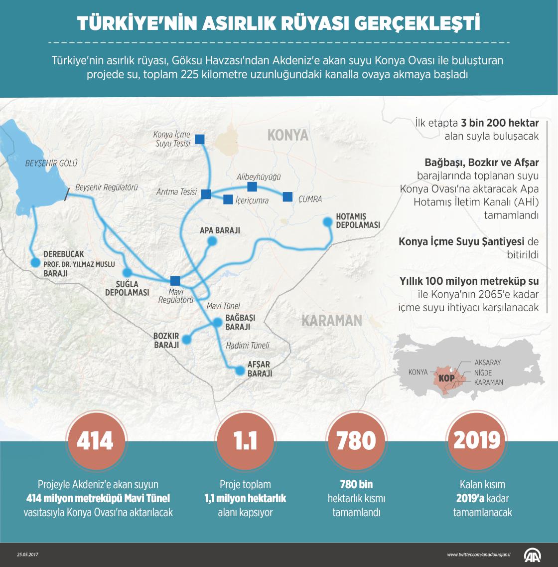 Türkiye'nin asırlık rüyası, Göksu Havzası'ndan Akdeniz'e akan suyu Konya Ovası ile buluşturan projede su, toplam 225 kilometre uzunluğundaki kanalla ovaya akmaya başladı. ( Kemal Delikmen - Anadolu Ajansı )