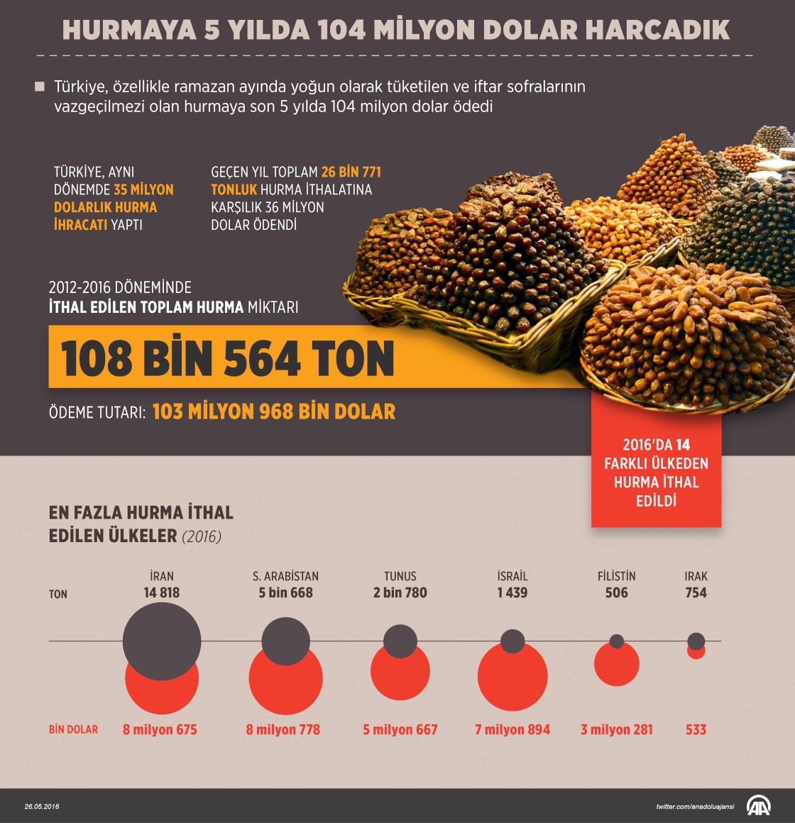 Türkiye, iftar sofralarının vazgeçilmezi hurmanın ithalatına 2012-2016 yılları arasında toplam 103 milyon 968 bin dolar harcadı. Türkiye aynı dönemde ise toplam 35 milyon dolarlık hurma ihracatı gerçekleştirdi. ( Murat Usubaliev - Anadolu Ajansı )