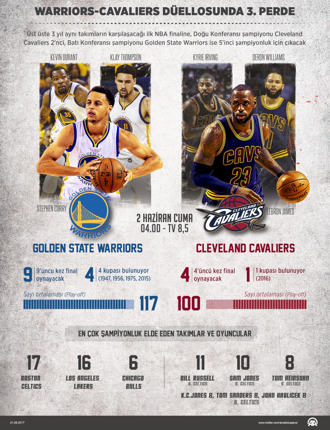 Üst üste 3 yıl aynı takımların karşılaşacağı ilk Amerikan Basketbol Ligi (NBA) finaline, Doğu Konferansı şampiyonu Cleveland Cavaliers 2'nci, Batı Konferansı şampiyonu Golden State Warriors ise 5'inci şampiyonluk için çıkacak. Geçen sezon LeBron James önderliğinde tarihinin ilk şampiyonluğunu kazanan Cavaliers ile önceki yıldan farklı olarak Kevin Durant'in bulunduğu kadrosuyla normal sezonu lider bitiren Warriors, 71'incisi yapılacak NBA finalinde karşılaşacak. ( Kemal Delikmen - Anadolu Ajansı )31 Mayıs 2017•Güncelleme: 31 Mayıs 2017