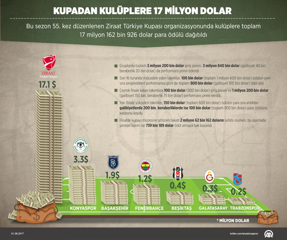 Final maçında Medipol Başakşehir'e penaltı atışları sonucunda üstünlük sağlayarak Ziraat Türkiye Kupası'nı müzesine götüren Atiker Konyaspor, 3 milyon 325 bin dolar ile bu organizasyonda en fazla gelir elde eden ekip oldu. Kupada final oynayan Medipol Başakşehir 1 milyon 942 bin dolar, yarı finalde elenen Fenerbahçe ise 1 milyon 238 bin dolar para ödülünü kasasına koydu. Kupada bu sezon Beşiktaş 428 bin, Galatasaray 388 bin, Trabzonspor da 268 bin dolar para ödülü kazandı. ( Muhammed Ali Yiğit - Anadolu Ajansı )01 Haziran 2017•Güncelleme: 01 Haziran 2017