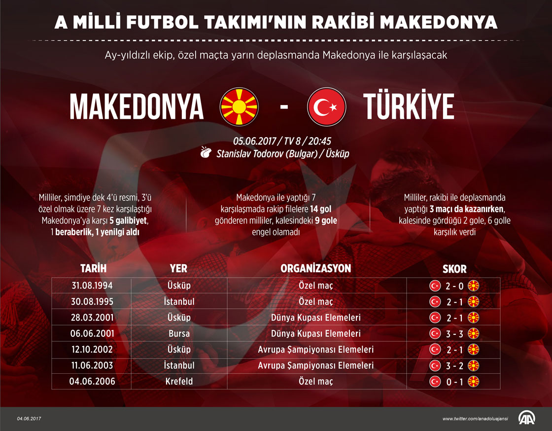 Ay-yıldızlı ekip, özel maçta yarın deplasmanda Makedonya ile karşılaşacak. Başkent Üsküp'teki II. Filip Arena'da yapılacak maçı Bulgar hakem Todorov yönetecek. Milli takım, daha önce Makedonya ile yaptığı 7 maçta 5 galibiyet, birer beraberlik ve yenilgi aldı. Haziran ayında bugüne kadar 75 maça çıkan milliler, 35'ini kazandı, 26 kez mağlup oldu. A Milli Futbol Takımı, teknik direktör Fatih Terim yönetiminde 134. müsabakasına çıkacak. Grafik: AA/Muhammed Ali Yİğit04 Haziran 2017•Güncelleme: 04 Haziran 2017