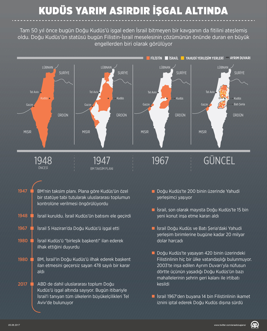 Tam 50 yıl önce bugün Doğu Kudüs'ü işgal eden İsrail bitmeyen bir kavganın da fitilini ateşlemiş oldu. Doğu Kudüs'ün statüsü bugün Filistin-İsrail meselesinin çözümünün önünde duran en büyük engellerden biri olarak görülüyor. ( Yasin Demirci - Anadolu Ajansı )
