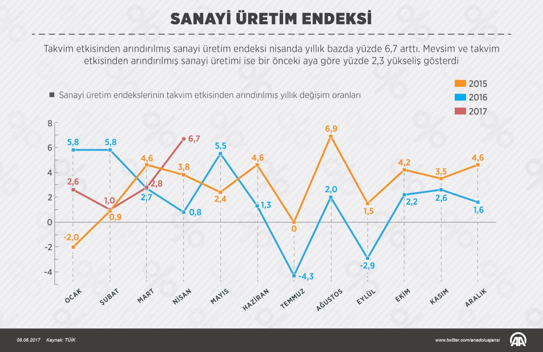 Türkiye İstatistik Kurumu (TÜİK), nisan ayına ilişkin sanayi üretim endeksi sonuçlarını açıkladı. Takvim etkisinden arındırılmış sanayi üretim endeksi, nisanda geçen yılın aynı ayına göre yüzde 6,7 arttı. Mevsim ve takvim etkisinden arındırılmış sanayi üretimi ise bir önceki aya göre yüzde 2,3 artış gösterdi. ( Ahmet Burak Özkan - Anadolu Ajansı )08 Haziran 2017•Güncelleme: 08 Haziran 2017