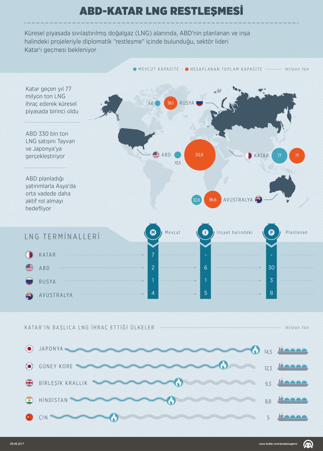 Uluslararası Doğalgaz Birliği ve Uluslararası LNG İthalatçıları Birliği verilerinden yapılan derlemeye göre, Katar geçen yıl yaklaşık 77 milyon ton LNG ihracatı gerçekleştirerek küresel piyasada birinci oldu. ABD'nin, planlanan ve inşaat halindeki projeleriyle 2024 yılına kadar sıvılaştırılmış doğalgazda (LNG) 300 milyon tonluk ihracat kapasitesine ulaşarak, diplomatik "restleşme" içinde bulunduğu sektör lideri Katar'ın tahtını sarsması bekleniyor. İnşaat halindeki 5 LNG terminalinin yanı sıra planlanan 30 LNG projesiyle ABD'nin orta vadede ihracat kapasitesinin 300 milyon tonu geçeceği öngörülüyor. ( Ahmet Burak Özkan - Anadolu Ajansı )09 Haziran 2017•Güncelleme: 09 Haziran 2017
