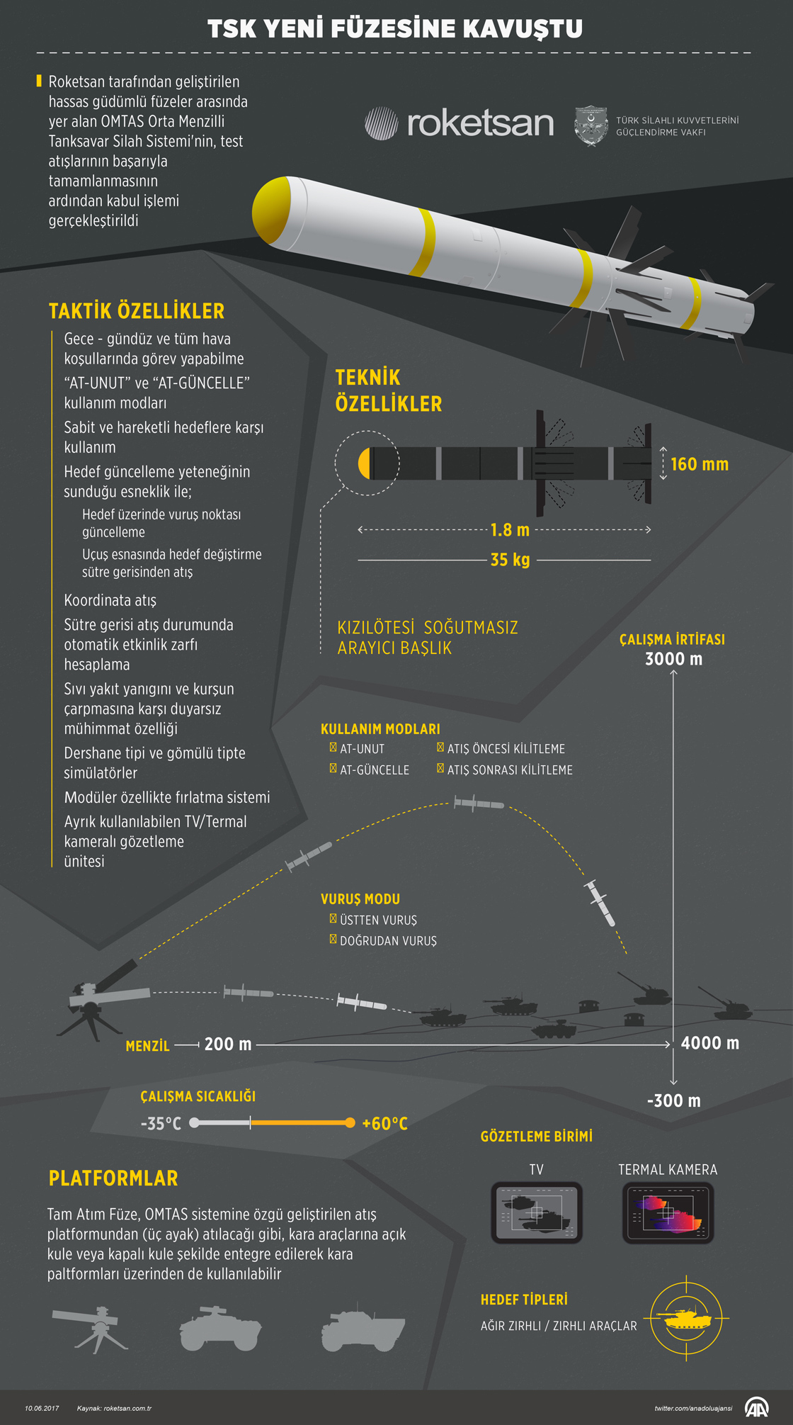 Türk Silahlı Kuvvetleri (TSK), OMTAS Fırlatma Sistemi ile 8 OMTAS tanksavar füzesinin kabul işlemlerini tamamladı. Yerli üretim silahlar bu ay içinde Kara Kuvvetleri Komutanlığınca kullanılmaya başlanacak.