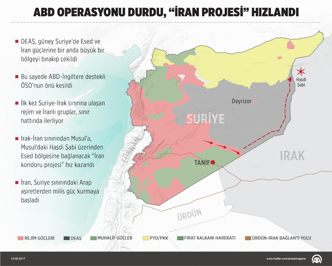 Suriye’nin güneyinde terör örgütü DEAŞ, binlerce kilometrekareyi bir anda Esed rejimi ve İran destekli gruplara bıraktı. Rejim ve İran güçleri bu sayede ABD-İngiltere destekli ÖSO operasyonunu durdurup, İran-Irak-Suriye koridoru projesine hız verdi.10 Haziran 2017•Güncelleme: 10 Haziran 2017