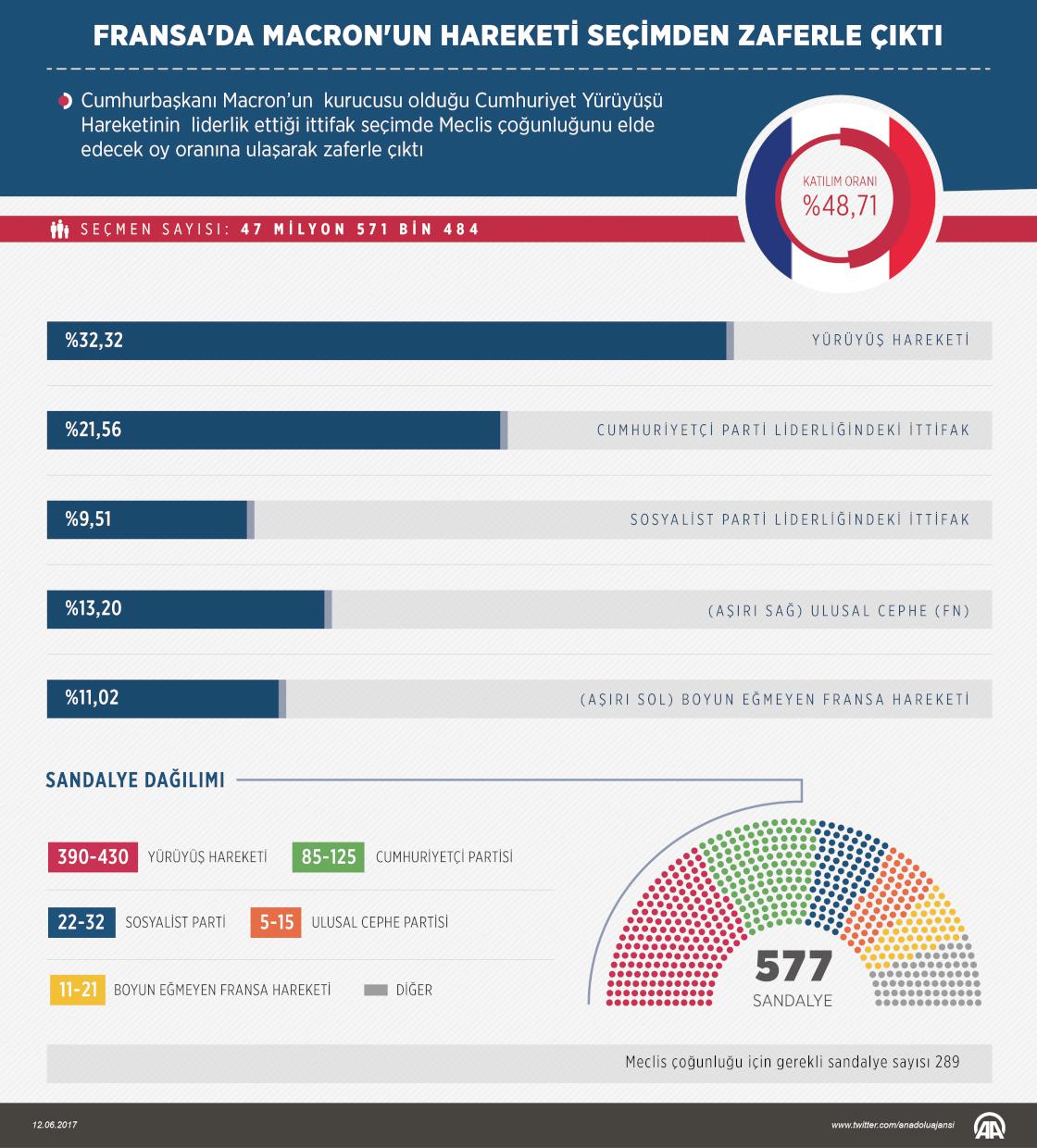 Fransa İçişleri Bakanlığının milletvekili genel seçimi ilk turu oy sayım sonuçlarına göre, Cumhurbaşkanı Emmanuel Macron'un kurucusu olduğu Cumhuriyet Yürüyüşü Hareketi (REM) ile ittifak kurduğu Demokrasi Hareketi (MODEM), Ulusal Mecliste görev yapacak 577 milletvekilinin çoğunluğunu elde edebiliyor. İçişleri Bakanlığın kesinleşmemiş verilerine göre, ülkede dün yapılan seçimde kullanılan oyların tamamı sayıldı. Meclis çoğunluğunun 289 milletvekili ile sağlandığı ülkede, oyların da yaklaşık yüzde 32,32'sini alan REM ile MODEM ittifakı, Ulusal Meclisteki 390 ila 430 arasındaki milletvekilliğini kazanarak çoğunluğu elde edebiliyor. Merkez sağ Cumhuriyetçi Parti (LR) liderliğindeki ittifak seçmenlerin yüzde 21,56 oyunu alarak milletvekili sayısı 85-125 arasında kalırken, Sosyalist Parti (PS) liderliğindeki ittifak ancak yüzde 9,51 oy oranıyla 22-32 arasında milletvekili çıkarabiliyor.