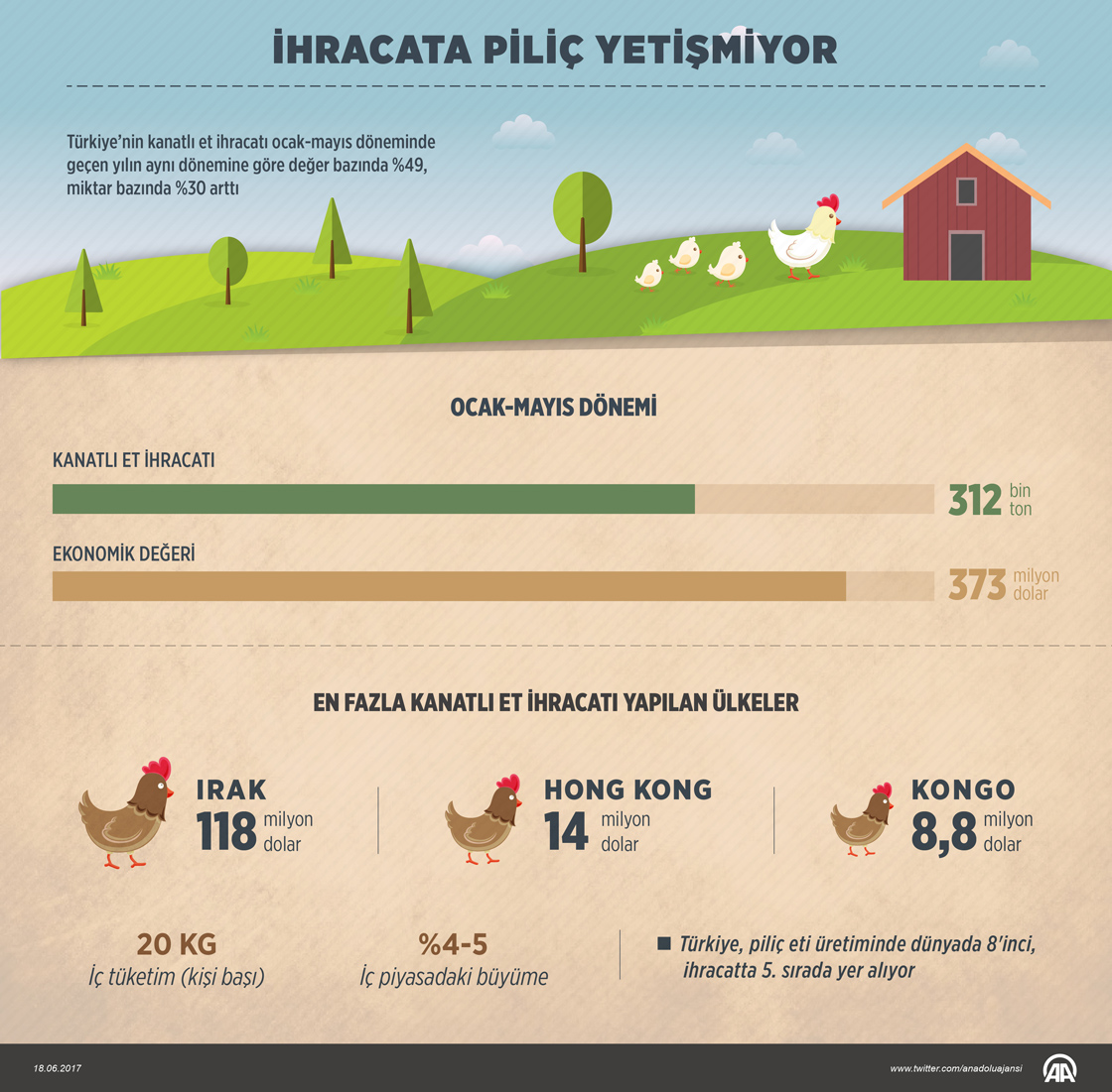 Türkiye'de ocak-mayıs 2017 döneminde 312 bin ton piliç eti ihracatıyla geçen yıla oranla önemli artışın sağlanması, yeni kümes yatırımlarını gündeme getirdi. Broyler tipi piliç üretilen kümesler, AB destekleri, Ziraat Bankası'nın sıfır faizli kredileri ve entegre tesislerin sağladığı kredilerle son dönemde cazip yatırım alanları arasında gösteriliyor. ( Muhammed Ali Yiğit - Anadolu Ajansı )18 Haziran 2017•Güncelleme: 18 Haziran 2017