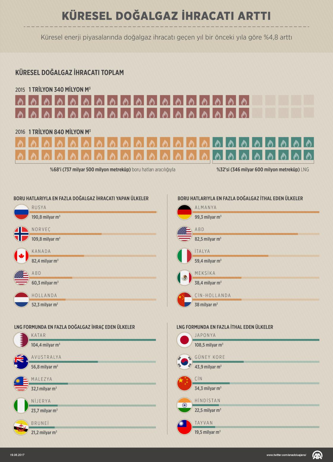 Küresel enerji piyasalarında doğalgaz ihracatı geçen yıl bir önceki yıla kıyasla yüzde 4,8 artarak 1 trilyon 840 milyon metreküp oldu. Doğalgaz satışlarının yüzde 68'i boru hatları aracılığıyla, yüzde 32'si LNG sevkiyatı yoluyla gerçekleştirildi. ( Muhammed Ali Yiğit - Anadolu Ajansı )19 Haziran 2017•Güncelleme: 19 Haziran 2017