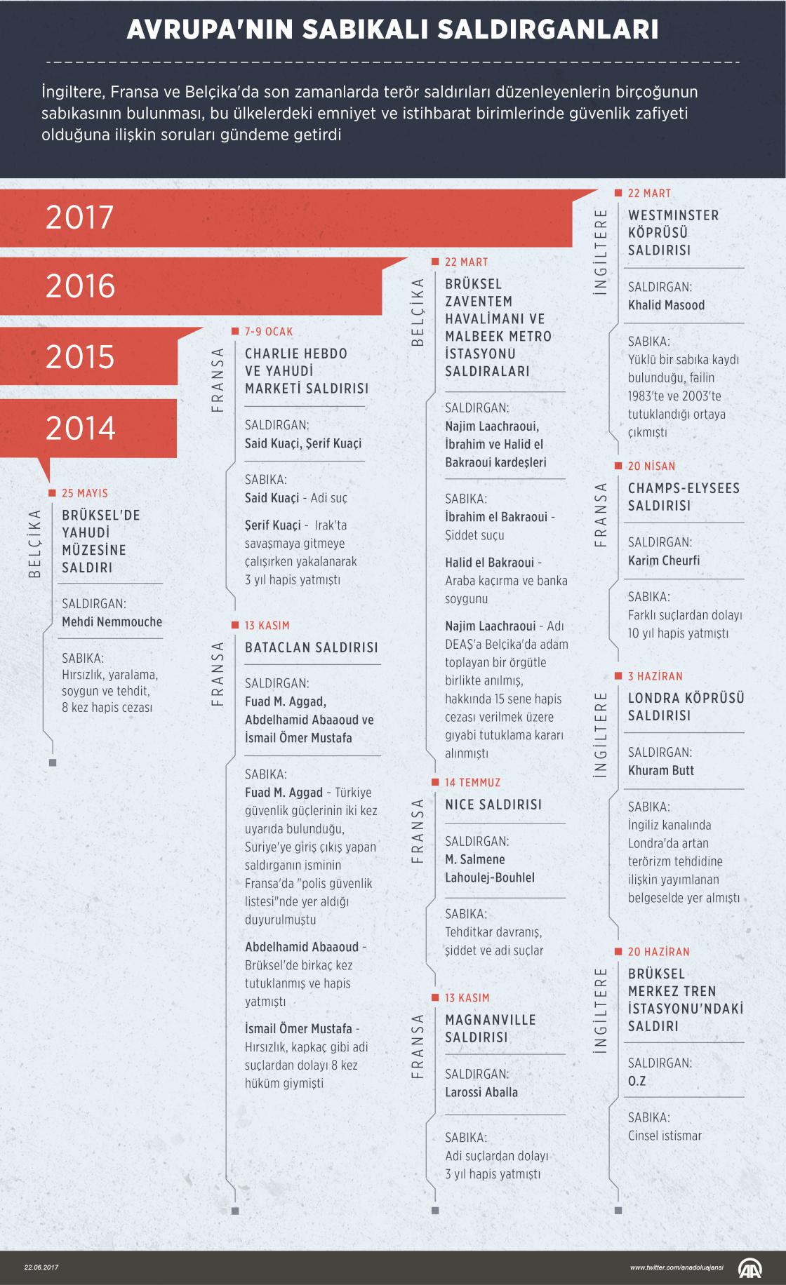 İngiltere, Fransa ve Belçika'da son zamanlarda terör saldırıları düzenleyenlerin birçoğunun sabıkasının bulunması, bu ülkelerdeki emniyet ve istihbarat birimlerinde güvenlik zafiyeti olduğuna ilişkin soruları gündeme getirdi. ( Ahmet Burak Özkan - Anadolu Ajansı )22 Haziran 2017•Güncelleme: 22 Haziran 2017