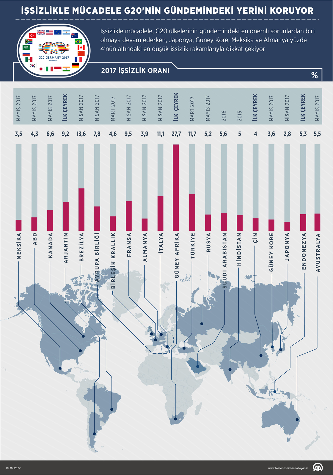 Dünya Bankası, Uluslararası Çalışma Örgütü ve ülkelerin istatistik kurumlarının verilerinden derlenen bilgilere göre, G20 ülkeleri arasında işsizlik oranının en yüksek olduğu ülkelerin başında yüzde 27,7 ile Güney Afrika yer alırken, bunu yüzde 13,6 ile Brezilya ve 11,7 ile Türkiye, yüzde 11,1 ile İtalya ve yüzde 9,5 ile Fransa izliyor. ( Gözde Gültekinler - Anadolu Ajansı )02 Temmuz 2017•Güncelleme: 02 Temmuz 2017