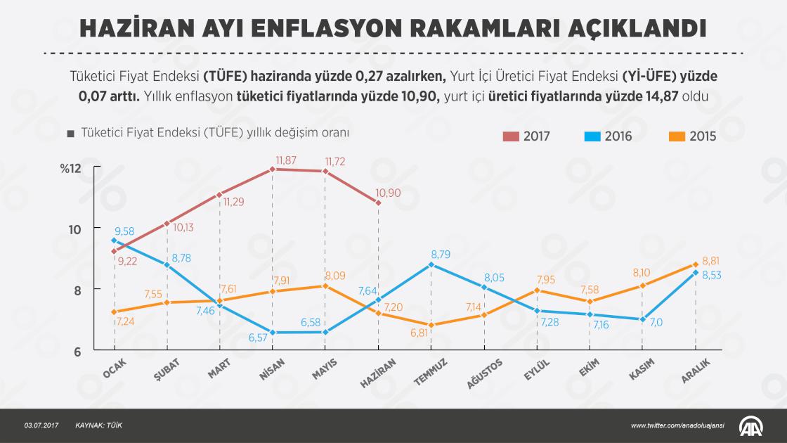 Tüketici Fiyat Endeksi (TÜFE) haziranda aylık bazda yüzde 0,27 azalırken, Yurt İçi Üretici Fiyat Endeksi (Yİ-ÜFE) yüzde 0,07 arttı. Yıllık enflasyon tüketici fiyatlarında yüzde 10,90, yurt içi üretici fiyatlarında yüzde 14,87 oldu. ( Muhammed Ali Yiğit - Anadolu Ajansı )03 Temmuz 2017•Güncelleme: 03 Temmuz 2017