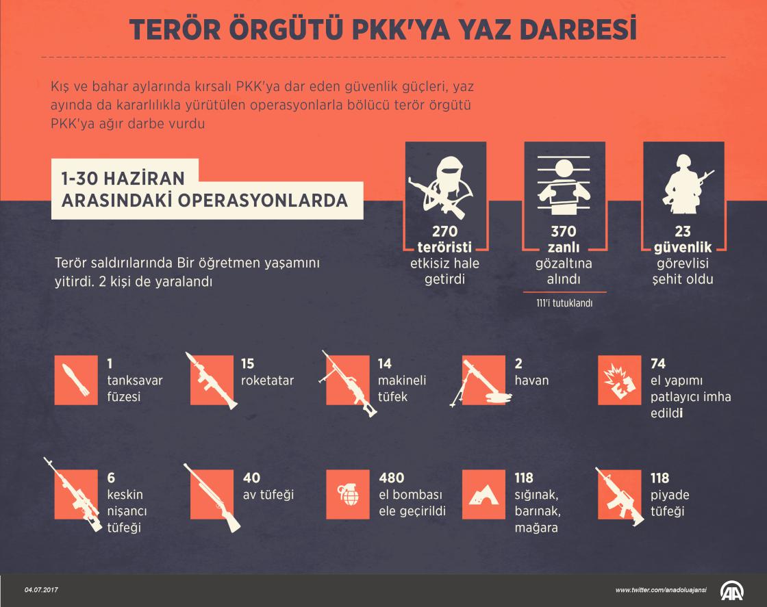 Türkiye'nin barış ve huzurunu bozmak için saldırılar düzenleyen, siviller ve çocukları dahi hedef almaktan çekinmeyen terör örgütü PKK'ya haziranda da göz açtırmayan güvenlik güçleri, 270 teröristi etkisiz hale getirdi. Teröristlere yönelik ülke genelinde haziranda düzenlenen operasyonlarda, bir tanksavar füzesi, 15 roketatar, 14 makineli tüfek, 2 havan, 118 piyade tüfeği, 6 keskin nişancı tüfeği, 40 av tüfeği ve 480 el bombası ele geçirildi, 74 el yapımı patlayıcı imha edildi. PKK ve örgütün gençlik yapılanmasına yönelik pek çok ilde hazirandaki operasyonlarda gözaltına alınan, aralarında HDP ve DBP'li yöneticilerin de yer aldığı 370 zanlıdan 111'i tutuklandı. ( Yasin Demirci - Anadolu Ajansı )04 Temmuz 2017•Güncelleme: 04 Temmuz 2017