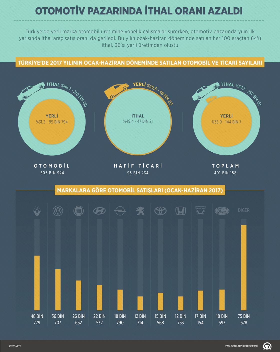 Türkiye otomotiv pazarında geçen yıl satılan araçların yüzde 68,4'ü ithal olurken, bu yılın ilk yarısında satılan her 100 araçtan 64'ü ithal, 36'sı yerli üretimden oluştu. Yılın ilk 6 ayında hafif ticari araç pazarında ise yerli araç satışları yüzde 50,6, ithal satışlar yüzde 49,4 seviyesinde gerçekleşti. ( Yasin Demirci - Anadolu Ajansı )06 Temmuz 2017•Güncelleme: 06 Temmuz 2017