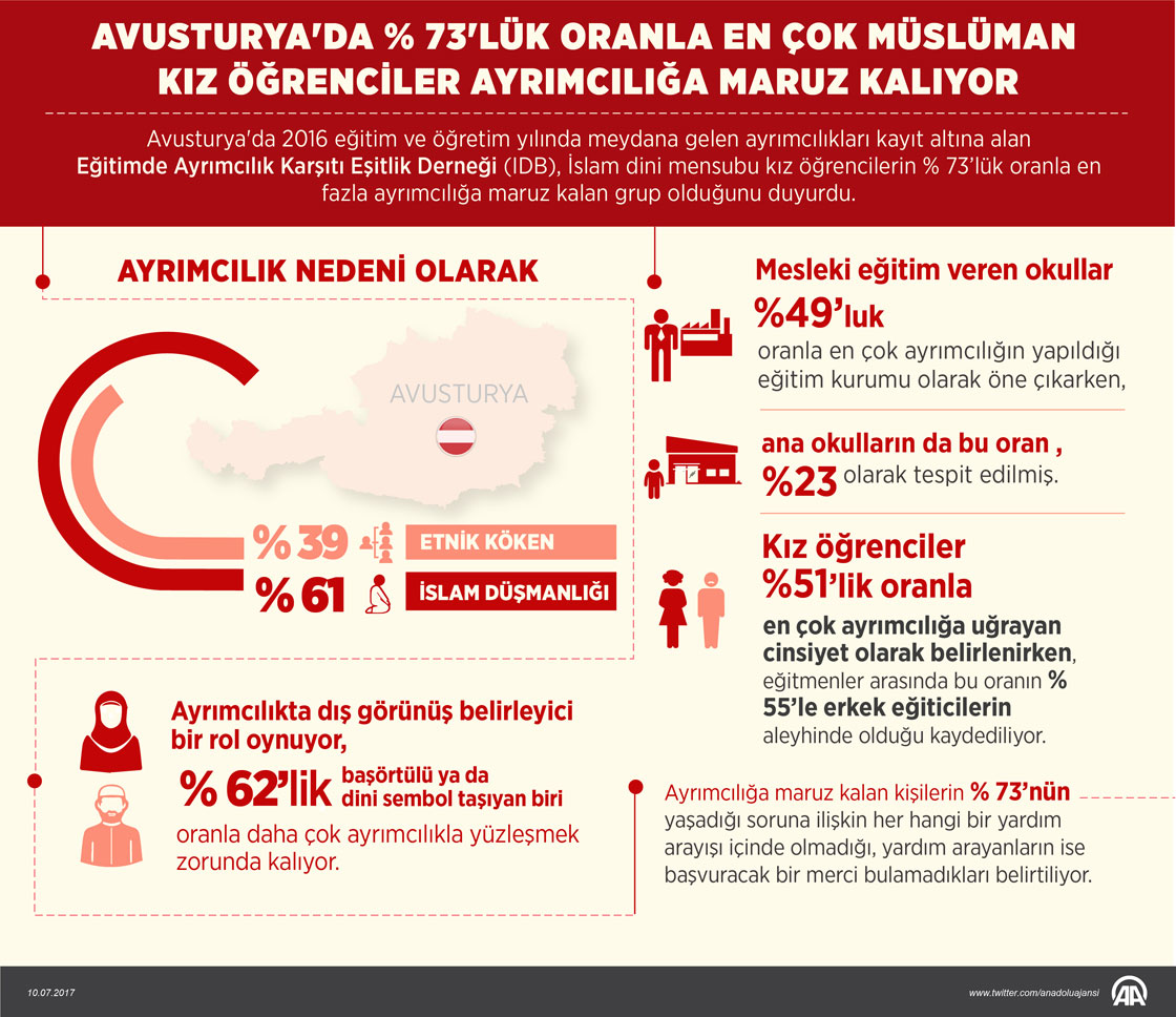 Avusturya'da geçen yıl okullarda Müslüman kız öğrencilerin yüzde 73’lük oranla en fazla ayrımcılığa maruz kalan kesimi oluşturduğu ortaya çıktı.