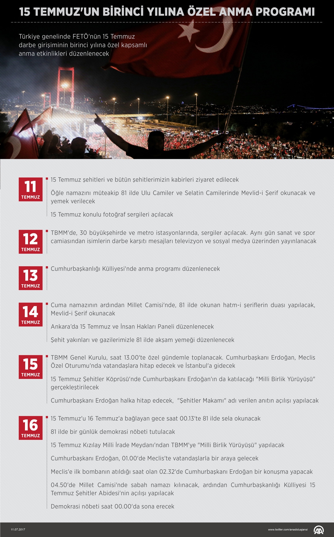 Türkiye genelinde FETÖ'nün 15 Temmuz darbe girişiminin birinci yılına özel kapsamlı anma etkinlikleri düzenlenecek. Cumhurbaşkanlığı himayesinde düzenlenecek 15 Temmuz Demokrasi ve Milli Birlik Günü anma etkinlikleri, 16 Temmuz sabahı sona erecek. ( Yasin Demirci - Anadolu Ajansı )11 Temmuz 2017•Güncelleme: 11 Temmuz 2017