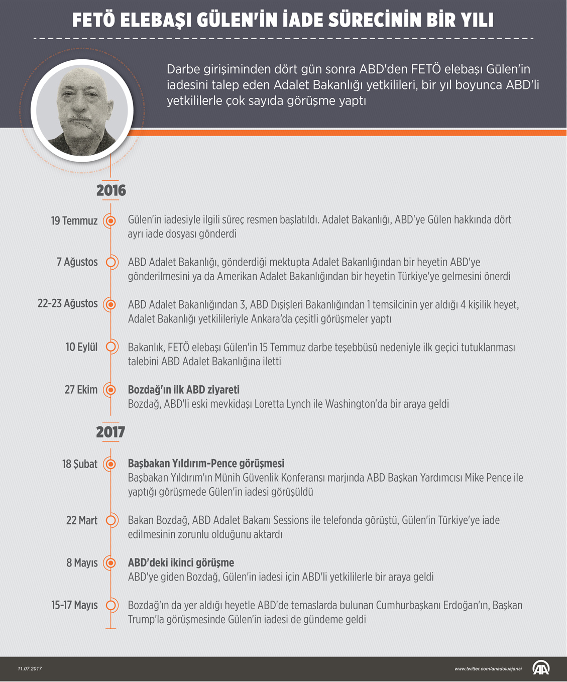 Fetullahçı Terör Örgütü'nün (FETÖ) darbe girişiminden 4 gün sonra ABD'den FETÖ elebaşı Fetullah Gülen'in iadesini talep eden Adalet Bakanlığı, ABD'li yetkililerle bugüne kadar çeşitli görüşmeler gerçekleştirdi.