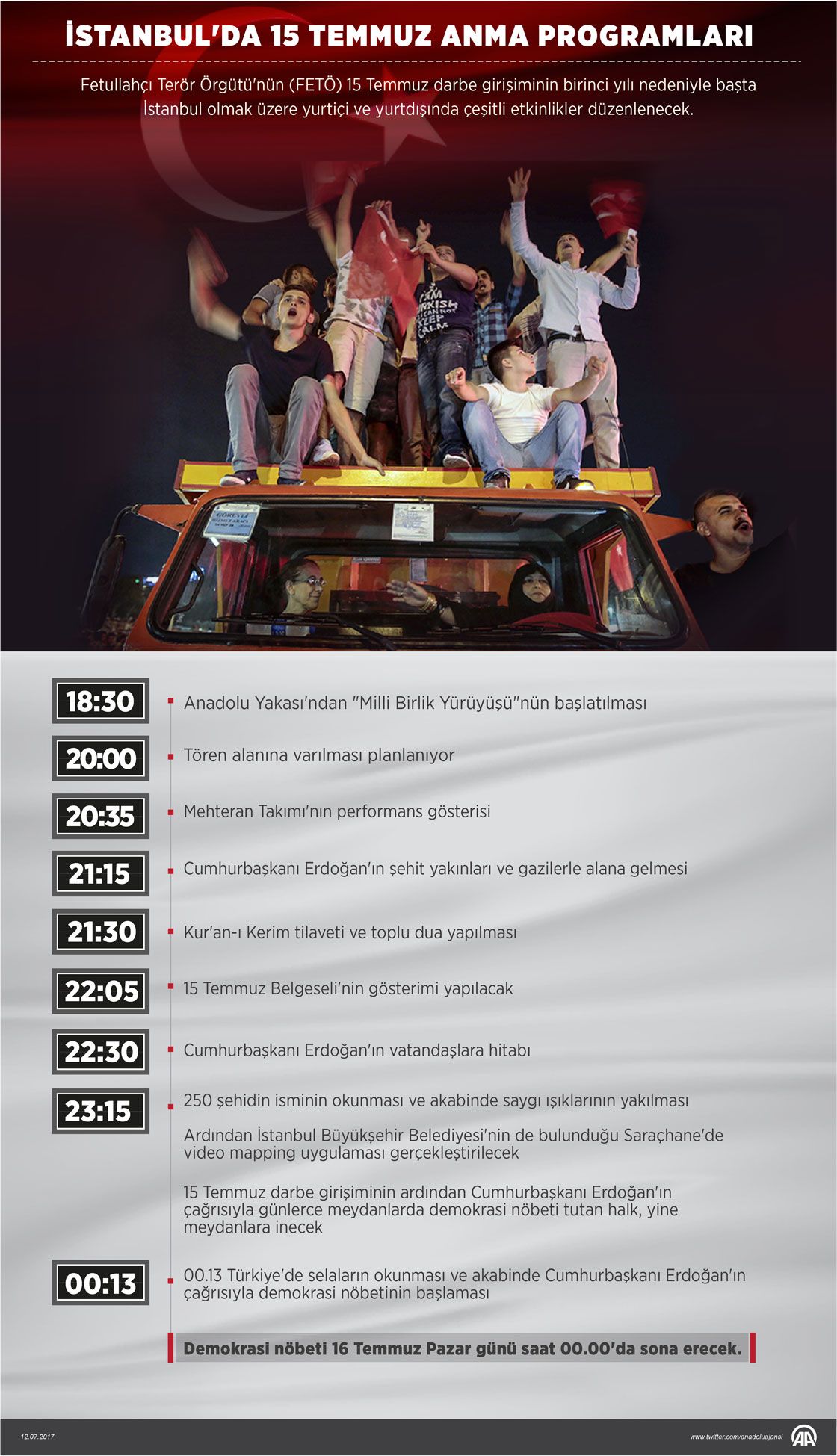 Fetullahçı Terör Örgütü'nün (FETÖ) 15 Temmuz'daki darbe girişiminin birinci yılında, "15 Temmuz Demokrasi ve Milli Birlik Günü" anma etkinlikleri çerçevesinde, İstanbul'da yoğun bir program icra edilecek